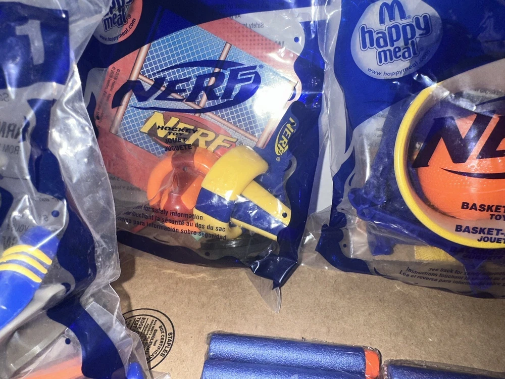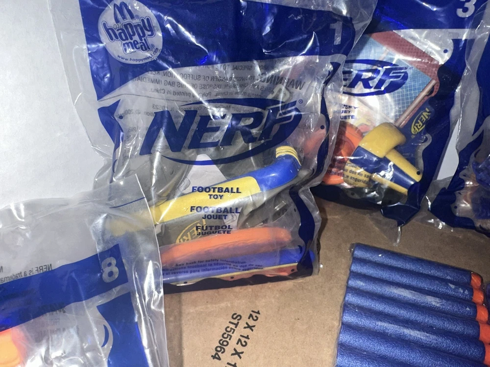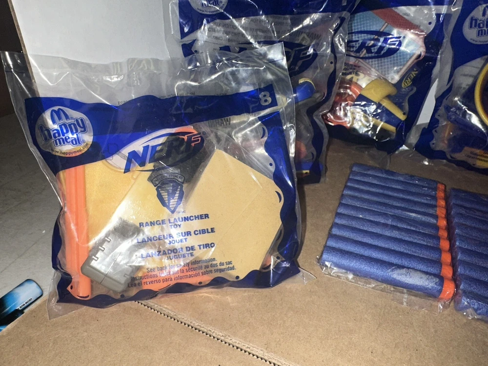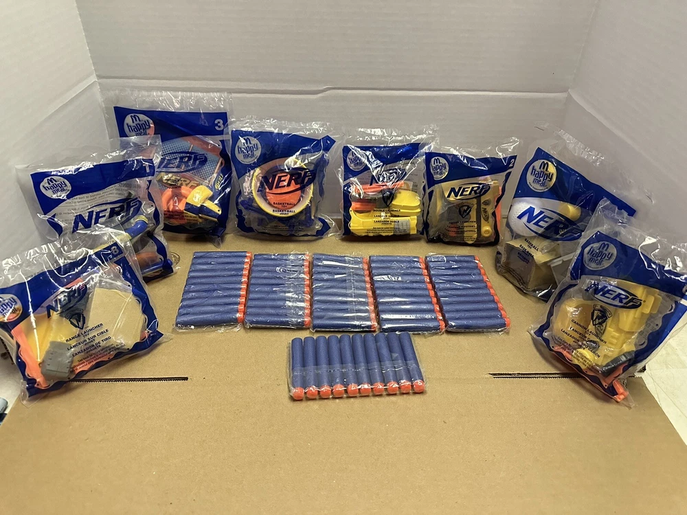 Complete set of eight McDonald’s happy meal Nerf toys And we have six packages of darts Non-smoking environment Make sure to give us a follow. And check out our store for more items like this.