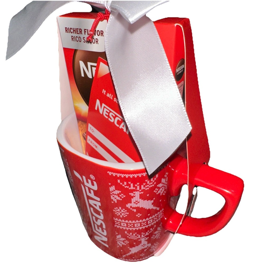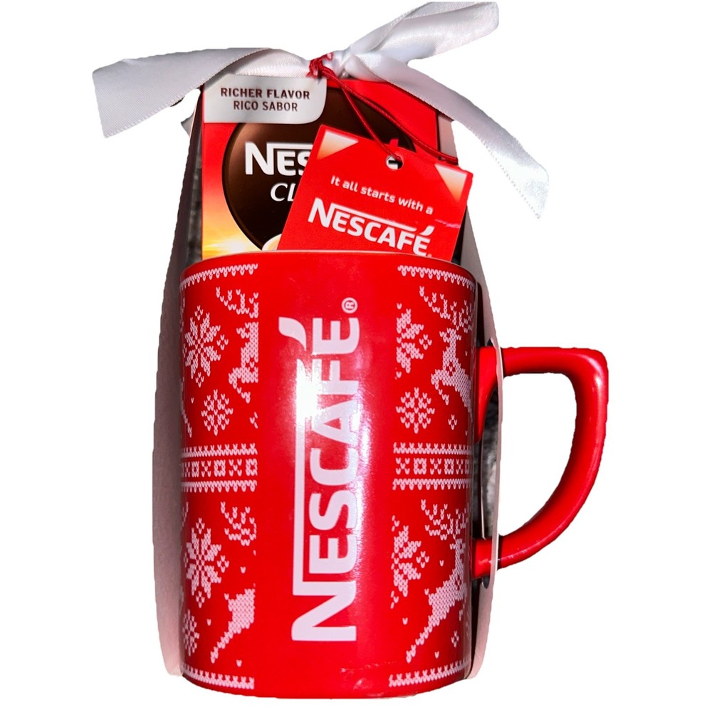 The Nescafe Red Coffee/Tea Mug is a ceramic collectible Christmas gift set featuring a square shape and a traditional design with a Christmas theme. This medium-sized mug can hold up to 10 oz of hot or cold beverages and is microwave and dishwasher safe for easy cleaning. The painted red color with a reindeer pattern adds a festive touch, making it a perfect gift for teens, unisex adults, and unisex kids. With its original Nescafe branding and seasonal theme, this mug is a charming addition to anyone's kitchen or home decor. ( ref white drawer 8/199)