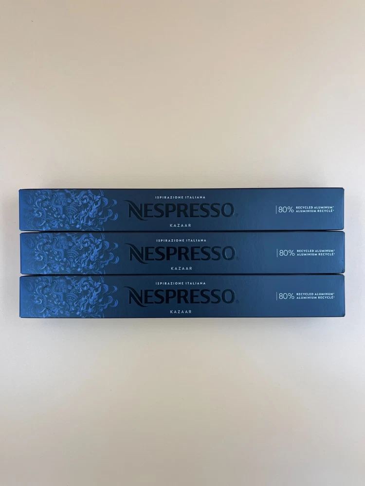 COFFEE BLEND:;;Brazilian ; Guatemalan Robusta and South American washed Arabica. Medium roasted – Nespresso Intensity 12.;;Exceptional intensity, rich in roasted notes, powerful bitterness with notes of pepper. DARK ROAST:; We split roast the coffees to bring out distinct qualities of each coffee in the; Kazaar blend. Most of the Arabica and Robusta get an intense roast to develop their bitterness and body. ESPRESSO BREWS 1.35 OZ and 0.845 OZ : These Nespresso Original pods are part of the Ispirazione Italiana range that will provide you with a 1.35 oz or 0.845 serving of a delicious coffee beverage CONTENTS: 30 capsules – 10 capsules per box. Each capsule brews Ristretto 0.845 OZ and Espresso 1.35 OZ SAVOR WITH MILK: Try this Kazaar with milk, and you’ll discover the intensity hasn’t gone away. The roasty, bitter boldness simply gets a harmonious chocolate and caramel twist when you add milk froth to make Kazaar Espresso Macchiato. Expiration Date: 04-30-2025