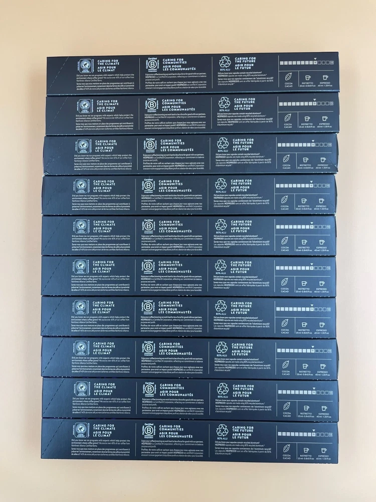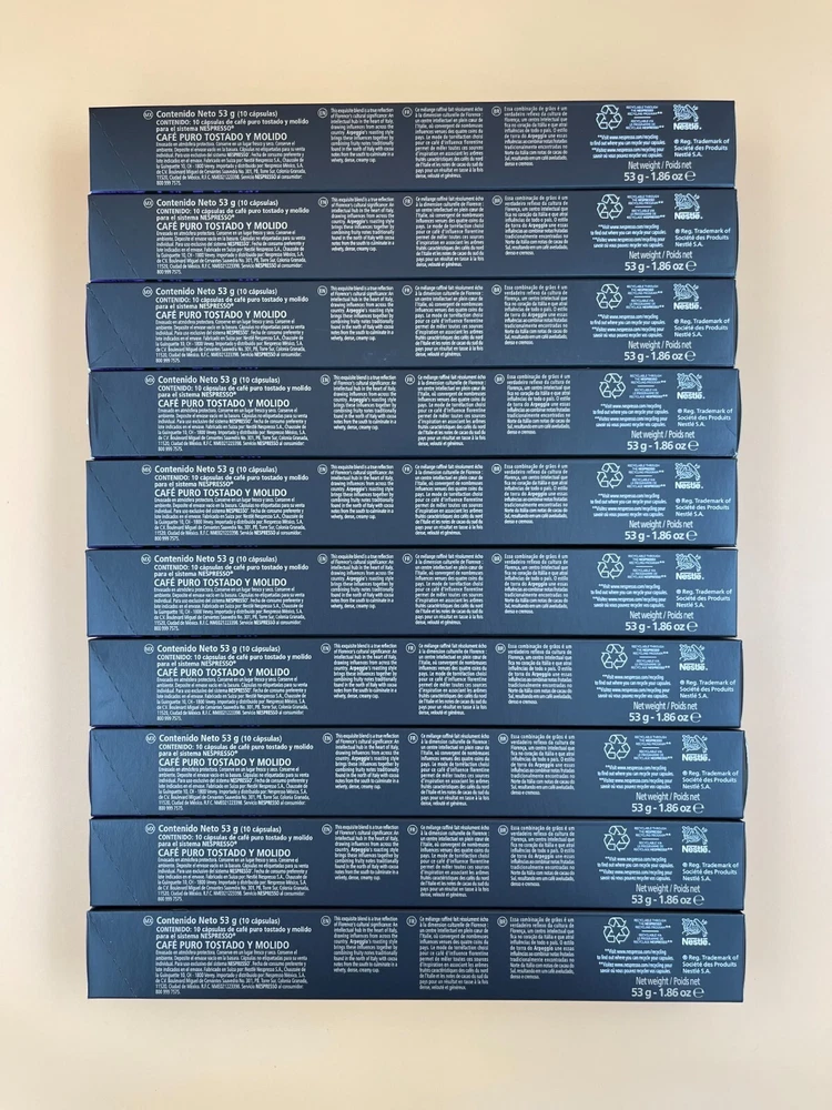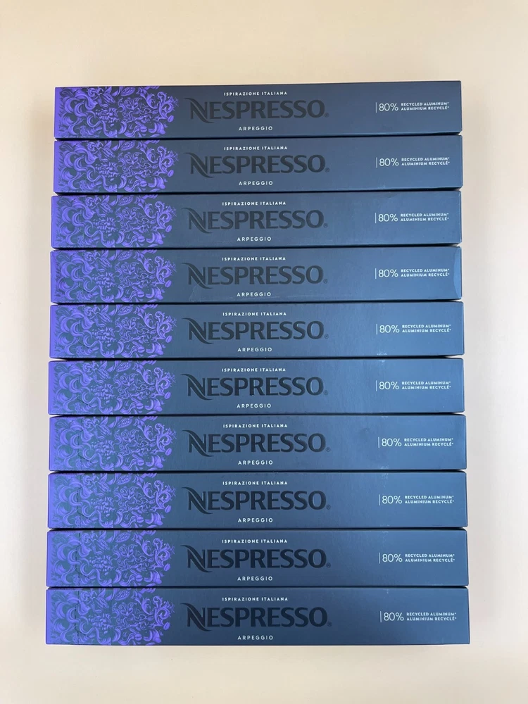 COFFEE BLEND:;Arpeggio is a;long roasted Central and South American Arabica;;dense and creamy with bold roasty and cocoa notes. The crema gives it a creamy, velvety texture that is irresistible.;Long roasted – Nespresso Intensity 9.; DARK ROAST: An intense roast of the coffee beans develops the distinct characteristics of each of Arpeggio’s coffees. It may be a blend, but it seeks to let each coffee shine.; SAVOR WITH MILK:;Arpeggio’s potent character can push through milk. It’s an intense coffee, but the sweet notes of Arabica mix well with milk froth to make this homage to Florence a characterful Latte Macchiato.; CONTENTS: 100 capsules – 10 capsules per box. Each capsule brews Ristretto 0.845 OZ and Espresso 1.35 OZ SUSTAINABILITY FIRST:;As a certified B Corporation,;Nespresso;meets the highest standards of verified social and environmental performance, joining a global movement using business as a force for good.;;Nespresso aluminum capsules are fully recyclable and guarantee coffee freshness - we provide different options for recycling your used aluminum coffee pods to fulfill our collective commitment to protecting the environment. Expiration Date: 12-31-2024