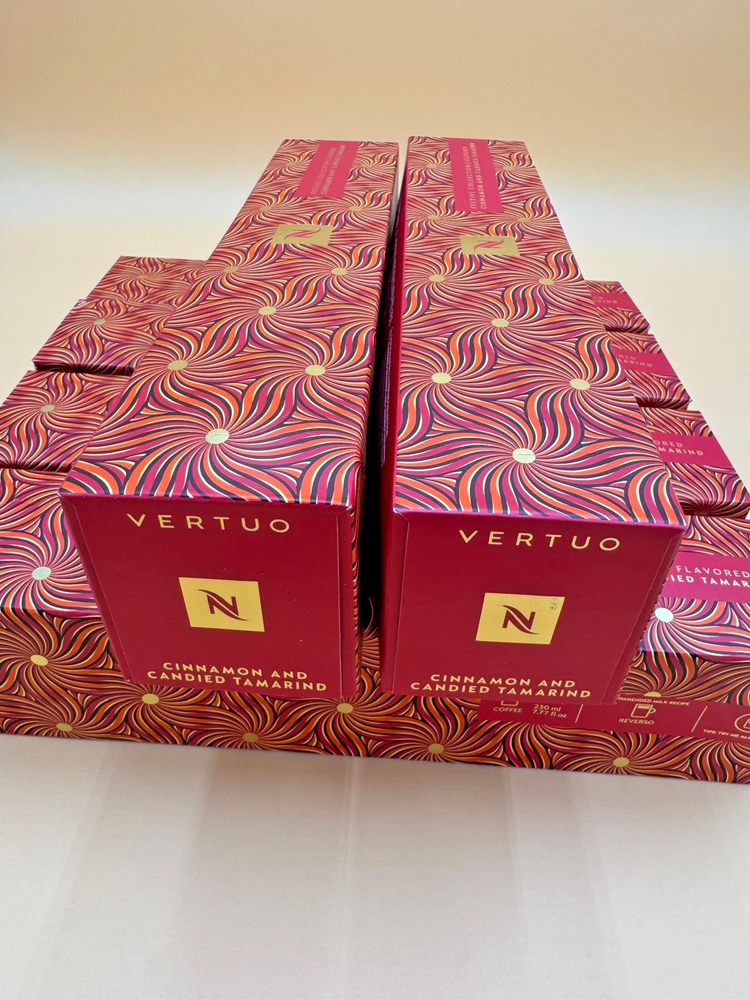 The Nespresso Cinnamon and Candied Tamarind VERTUO coffee pods are a limited edition holiday release for the year 2025 6 Sleeves 60 PODS.. These coffee pods come in a sleeve and are compatible with Nespresso and Nespresso Vertuo machines. The medium roast coffee pods have a unique flavor combination of cinnamon and candied tamarind, providing a festive and aromatic experience for coffee lovers. Each pod is designed to serve one cup of delicious coffee, making it a convenient and indulgent choice for the holiday season.