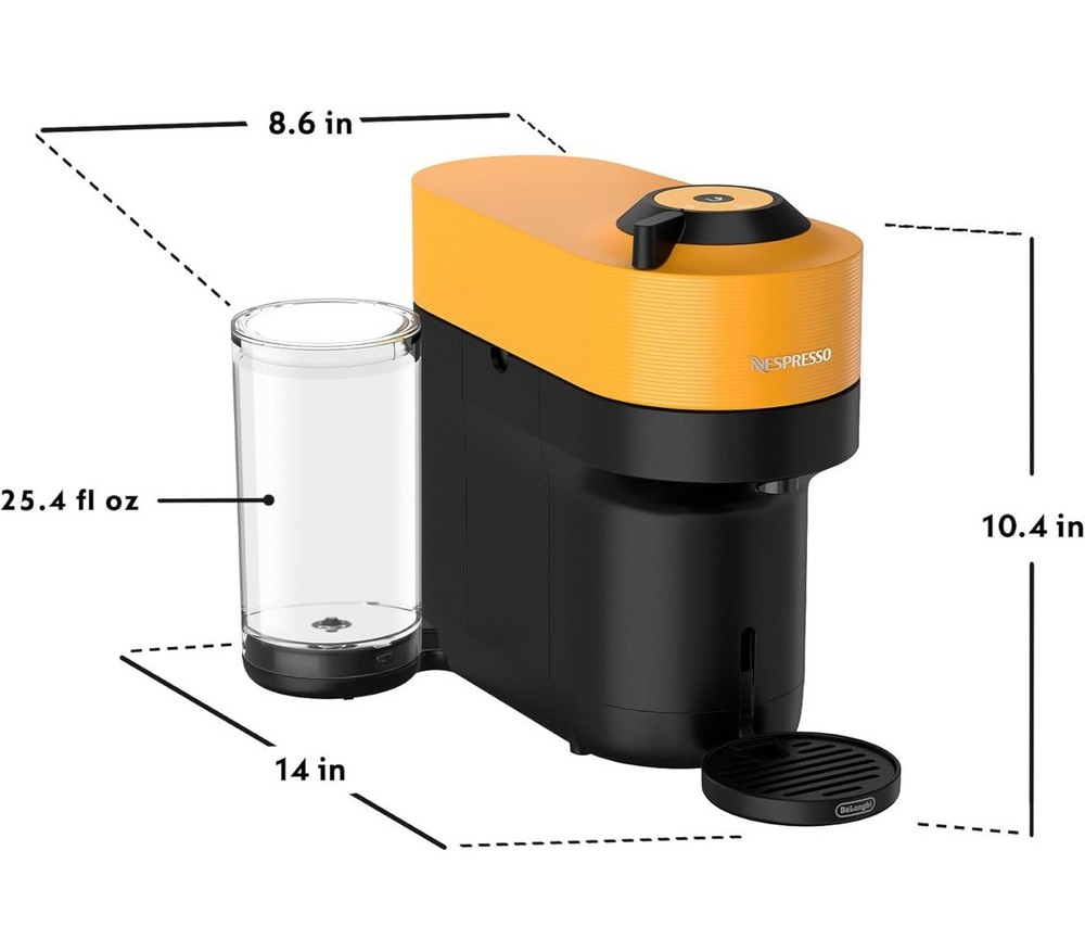 PAID $170! Brand : Nespresso Capacity : 25.4 Fluid Ounces Color : Mango Product Dimensions : 14"D x 8.6"W x 10.4"H Special Feature : App-Controlled, Removable Tank Coffee Maker Type : Espresso Machine Compact design to fit small spaces, with removable 25 fl. oz water tank placed on the side for easy access and refill. The Nespresso Espresso Machine by De'Longhi in Mango Yellow is a stylish and high-quality coffee machine designed for capsule coffee lovers. With a sleek black exterior and durable plastic construction, this espresso machine is both functional and visually appealing. It boasts a quick heat up time of 20-25 seconds, making it perfect for those who enjoy a speedy morning routine. Nespresso capsules are specifically designed for this machine, ensuring rich and flavorful espresso every time. The machine also comes with a 1-year manufacturer warranty and features a convenient water tank for easy refilling. Enjoy barista-quality coffee in the comfort of your own home with this Nespresso Espresso Machine.