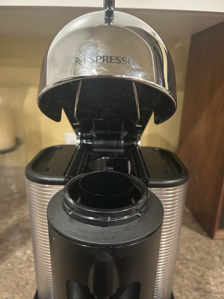 Nespresso Vertuo Coffee & Espresso Machine by Breville – Chrome with set of 4 ceramic espresso cups Gently used Nespresso Vertuo machine by Breville in great working condition. Brews a variety of coffee and espresso sizes using Vertuo pods with barcode scanning technology. • Chrome finish with sleek design • One-touch brewing system • Compatible with Nespresso Vertuo capsules only • Makes espresso, double espresso, gran lungo, coffee, and alto • Includes removable water tank and used capsule container Perfect for anyone looking for quick, high-quality coffee at home. Clean and ready to use. Pickup preferred. Let me know if you have any questions!