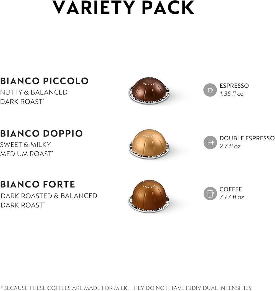 Nespresso, Vertuo Line, Bianco Variety Pack, 30 Count 30 (Pack of 1) Product Details Manufacturer: Nespresso Item Weight: 1.76 ounces Product Dimensions: 5.91 x 1.97 x 1.97 inches Size: 30 Count (Pack of 1) Number Of Pieces: 3 Brand: Nespresso Item Form: Capsule Flavor: Bianco Caffeine Content Description: Caffeinated Roast Level: Medium Roast Savor With Milk: These coffee capsules were conceived to be drunk exclusively with milk This Nespresso Vertuo coffee and espresso pod assortment contains a variety of Nespresso capsule coffee blends: 10 Bianco Piccolo, 10 Bianco Forte, 10 Bianco Doppio VERTUO BARISTA FLAVOR PACK COFFEE BREWS 7.77 FL. OZ, 2.7 FL OZ., and 1.35 FL. OZ.: These Nespresso VertuoLine pods provide you with a serving of coffee which is perfect for drinking with milk: Bianco Piccolo brews 1.35 fl. oz., Bianco Doppio brews 2.7 fl. oz, Bianco Forte brews 7.77 fl. oz., Sustainability First: As a certified B Corporation, Nespresso meets the highest standards of verified social and environmental performance, joining a global movement using business as a force for good. Machine Compatibility: Nespresso Vertuo pods are not compatible with Original Line machines. Nespresso, Vertuo Line, Bianco Variety Pack, 30 Count