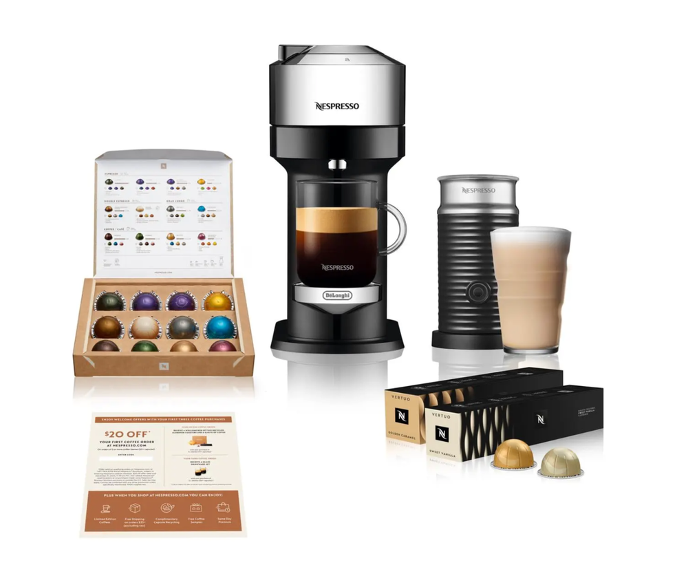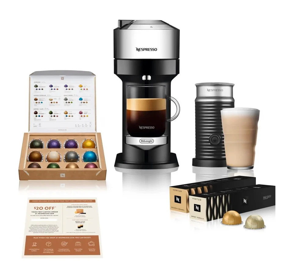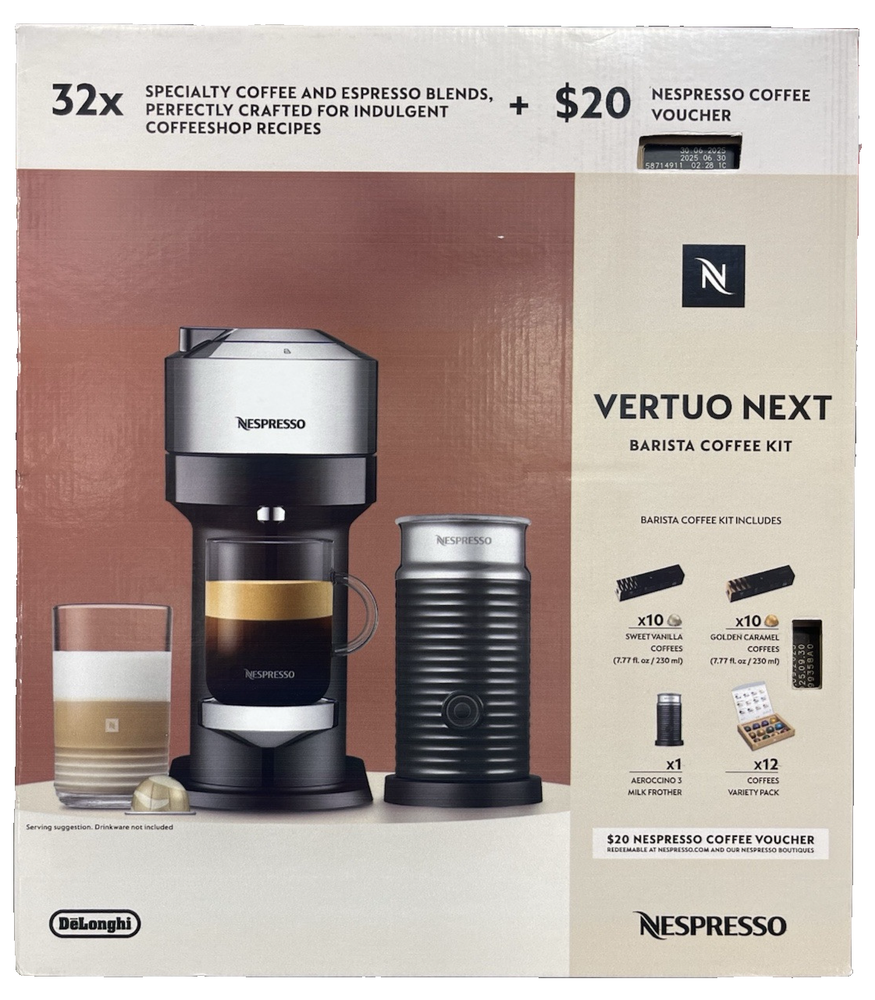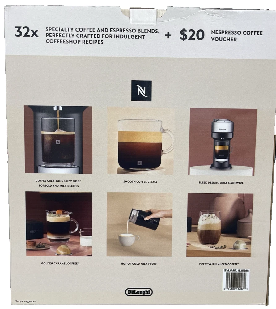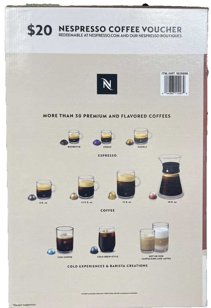 FAST FREE SHIPPING IN USA!!! ORDERS RECEIVED BEFORE 2PM - SAME DAY SHIPMENT!!! AFTER 2PM - NEXT DAY SHIPMENT!!! OUR WAREHOUSE WORKING MO-SAT(9am-9pm) CLEARANCE! Last pieces remaining—future availability currently unknown!!! "Discover our store! Explore a variety of interesting products at great prices. Don’t miss out—check it out now!" Features: Aeroccino 3 Milk Frother for Cappuccinos and Lattes 32 Coffee & Espresso Capsules Included - VALUE 40$ $20 Coffee Voucher to Nespresso.com Specifications Brand Nespresso Dimensions: W x D x H 5.5 in. x 14.2 in. x 12 in. Model ENV120CAE Type Single Serve Water Tank Capacity 37 Ounce Weight 8.8 lb.