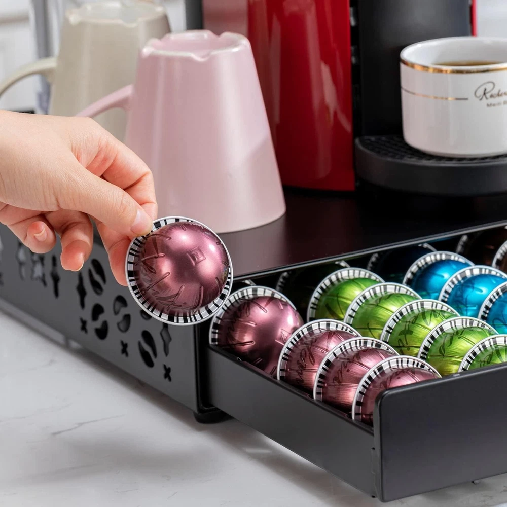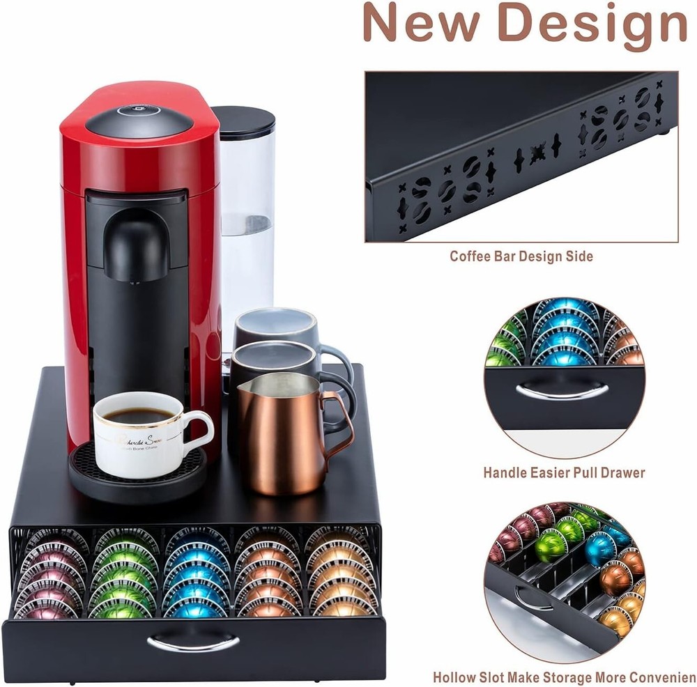 Nespresso Pod Holder Vertuo Pod Storage Coffee Pod Organizer Coffee Bar Design And Coffee Machine Stand Black Metal(50 Pods Capacity) Description: 【Elegant, Sleek and Versatile】Flagship vertuo pod hloder adopt modern design and easy to blend into the coffee bar, so that your coffee bar looks more elegant. 【50 Vertuo Capacity】Holds up to 50 pods for Nespresso Vertuo pods. This capsules holder holded up 5 boxes pods capacity with Vertuo Next, Vertuo Plus, Vertuo Evoluo ect. 【Save Space】Size:12.6''*16.07''*3.23''.You only need to use a small area to fit a large number of Nespresso pods.That's enough coffee for your entire family for a week, but takes up a lot of your little counter space. 【Sturdy Frame】Upgraded frame ensures not easily to brend like other normal pillar frame.All frame is made of metal which has longer life than plastic. 【Easy to Organize】Easy to pull out drawer and put in pods offer the best user experience. The hollow place design can be organized your coffee capsule easily.