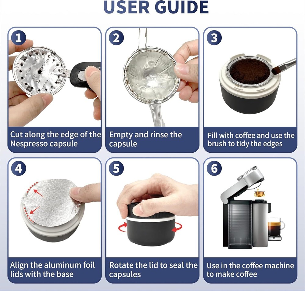 Reusable Pods Kit for Nespresso Vertuo, 1 Holder + 100 Lids + 1 Scoop Product Details Material: Aluminum Brand: sootozy Shape: Basket Number of Pieces: 100 Unit Count: 1.0 Count Manufacturer: sootozy Package Dimensions: 6.73 x 3.39 x 2.72 inches Item Weight: 9.9 ounces Country of Origin: China Item model number: COF-02 Save money and Reduce Waste: With our Reusable Pods Kit, there's no longer any need for wasted foil tops or grounds scattered everywhere. It's a fantastic solution for saving money and cutting down on both paper and coffee waste Designed for Nespresso Vertuo Capsules: Our coffee pod covers foil lids kit is specifically designed for Nespresso Vertuo Capsules, accommodating cup sizes of 1.35oz, 2.7oz, 5.07oz, and 7.77oz. Please note that it is not compatible with Nespresso OriginalLine Capsules. Comprehensive Kit: Our reusable coffee capsule kit for nespresso comes complete with a capsule base, 100 aluminum foil seals, a cleaning brush, and a scoop (pods not included). With this kit, you can effortlessly craft high-quality, reusable coffee pods using your favorite coffee. Easy to Use: Refilling your coffee pods with our reusable pods kit is quick. simply place the emppodsty capsule into the base, add your preferred coffee, and use the foils to align along the edge of the capsule. then, press the top cover of the base to create a new capsule. Flawless Sealing for Your Nespresso Vertuo Pods: Our reusable pods for nespresso ensures a perfect seal every time, preventing any messy spills caused by unsealing capsules.