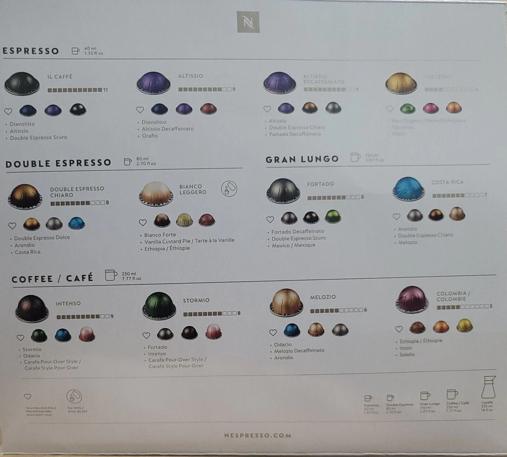 Item specifics Condition New: A brand-new, unused,See the seller's listing for full details. See all condition definitionsopens in a new window or tab Brand Nespresso Food Aisle Pantry Type Espresso Product Coffee Pod & Capsule Compatibility Nespresso Country/Region of Manufacture Switzerland Serving Size Mixed Flavor UPC 7630311534678 Item description from the seller Nespresso Vertuo Vertuoline Variety 12xPk12 Total 144 Capsules Pods Bulk I pen all the boxes to fit in flat rate medium box. As you see it in the picture. Bulk For the Exp Date MAR 31 2025 check the pics Please. BULK Espresso: 12 IL Caffe - 12 Altisso- 12 Altisso Decaffeinato - 12 Voltesso. Double Espresso: 12 Chiaro - 12 Blanco Doppio. Gran Lungo: 12 Fortado - 12 Costa Rica. Coffee: 12 Intenso - 12 Stormio - 12 Melozio - 12 Colombia Colombie