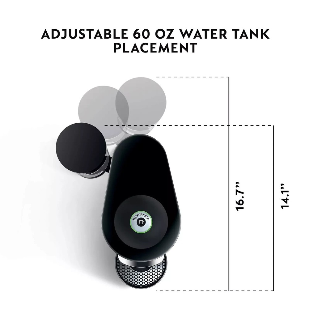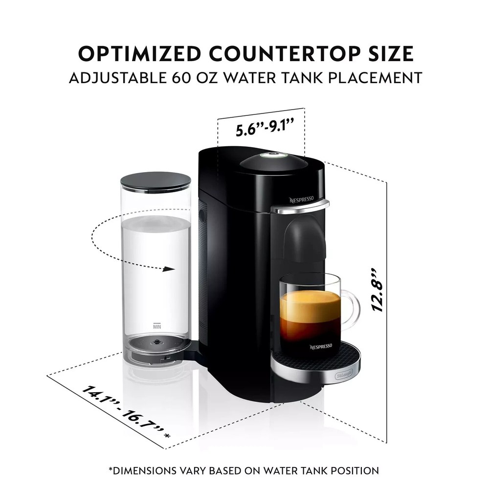 Product Details: Brand: Nespresso Capacity: 3.8 Pounds Color: Black Product Dimensions: 5.59"D x 16.88"W x 12.79"H Special Feature: Programmable Brand: Nespresso Capacity: 3.8 Pounds Color: Black Product Dimensions: 5.59"D x 16.88"W x 12.79"H Special Feature: Programmable Coffee Maker Type: Espresso Machine Material: Plastic Filter Type: Reusable Style: Machine Only Specific Uses For Product: Coffee maker Item Weight: 10.27 Pounds Included Components: VertuoPlus Deluxe machine Operation Mode: Fully Automatic Wattage: 1350 watts Voltage: 120 Volts Model Name: VertuoPlus Deluxe Number of Items: 1 Human Interface Input: Buttons Package Type: Standard Packaging Item Weight: 10.27 pounds Manufacturer: De'Longhi Country of Origin: USA Item model number: 0132193500