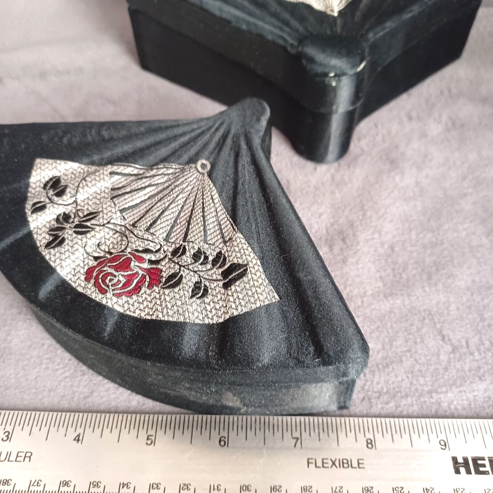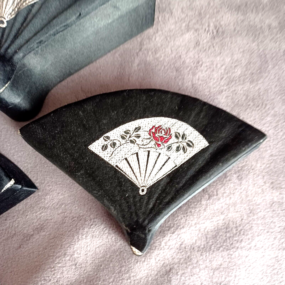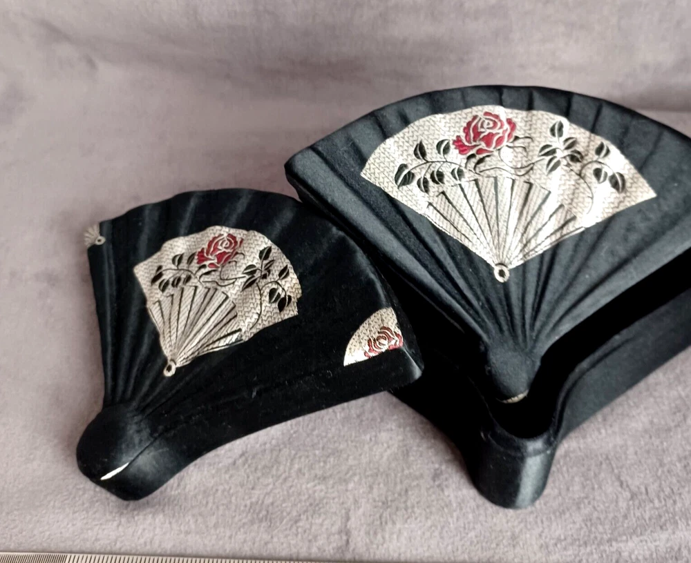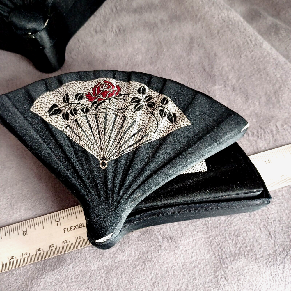 This beautiful set of 3 trinket boxes is a must-have for any collector of vintage and unique items. The intricate brocade design of a fan with a red rose adds a touch of elegance and sophistication to any room. The fan-shaped design is perfect for storing small items, such as jewelry or trinkets. Vintage Hand Made in China Signed. Rare Set. Small 6.5" Medium 7.5" Large 8.5" Height Nested 2.5"