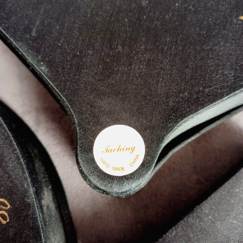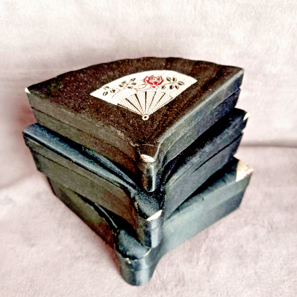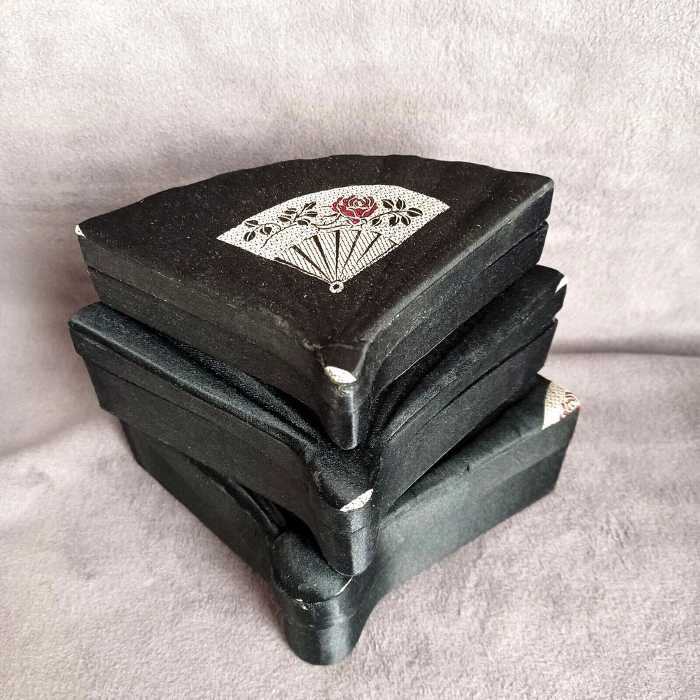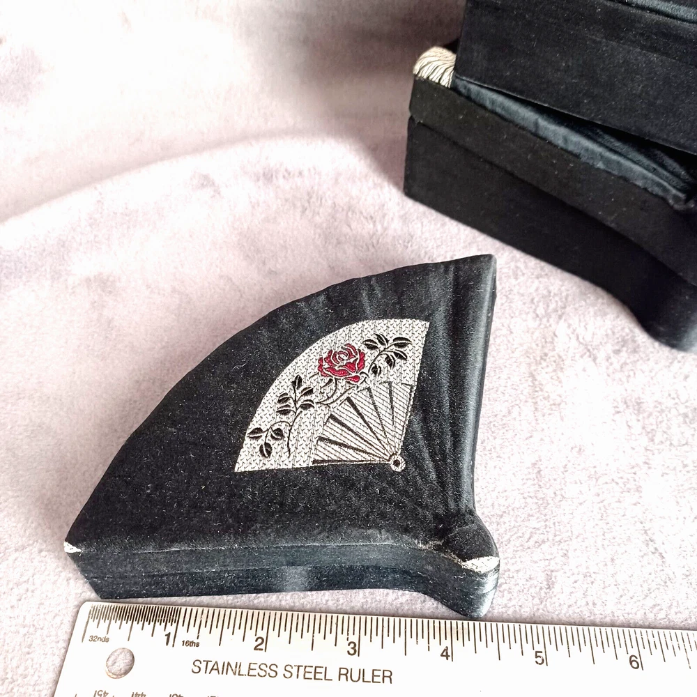 This beautiful set of 3 trinket boxes is a must-have for any collector of vintage and unique items. The intricate brocade design of a fan with a red rose adds a touch of elegance and sophistication to any room. The fan-shaped design is perfect for storing small items, such as jewelry or trinkets. Vintage Hand Made in China Signed. Rare Set. Small 6.5" Medium 7.5" Large 8.5" Height Nested 2.5"