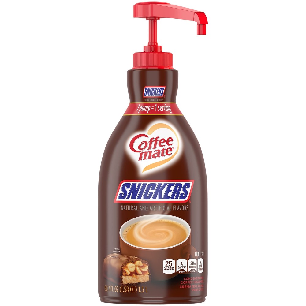 Description: Nestle Coffee mate Snickers Flavored Coffee Creamer Liquid Concentrate Pump Bottle is a rich blend of chocolate, nut, and caramel flavors that will enhance your cup of coffee. Packaged in a 1.5 L liquid concentrate pump bottle, this format is an easy-to-use, minimally packaged, and convenient solution for your customers. Our pump bottle format makes no mess, is easy to clean, and helps reduce waste. Its unique pump system locks the pump to the bottle once installed, making it impossible to remove and entirely tamper proof. Coffee mate liquid concentrate creamer does not need to be refrigerated and will retain its great flavor at room temperature for up to 9 months unopened. Easy to use - simply pump the desired number of pumps to flavor your cup. One pump equals one liquid creamer single; 300 servings per bottle. Lactose-Free; Cholesterol-Free; Gluten-Free; Kosher Dairy. Coffee mate is America's 1 coffee creamer. With a variety of flavors and formats, Coffee mate has your coffee creamer needs covered. Delight your employees, customers and guests by offering Coffee mate liquid creamer in your workplace, break room or kitchen. Features: Flavored Coffee Creamer: Nestle Coffee mate Snickers Flavored Liquid Concentrate Pump Bottle adds a rich blend of chocolate, nut, and caramel flavor to your cup of coffee Simple Indulgence: Stir our bulk liquid creamer into a cup of coffee for delicious added flavor that's lactose and cholesterol-free; pump bottle reduces waste, is easy to clean, and tamper-proof (unique pump system locks pump to bottle making it impossible to remove or tamper with) Delicious Flavor You Can Rely On: Shelf stable, no refrigeration needed, retain their delicious flavor at room temperature for up to 9 months; 30 day shelf life once opened Liquid Concentrate Formula: Our liquid concentrate Coffee mate pump bottle formula is thicker than our other liquid formats, and is specifically formulated to easily dispense through the pump system; one pump equals one creamer single; 300 servings per bottle; blends quickly with both hot and cold beverages Dietary Benefits: Non-Dairy + Lactose-Free + Cholesterol-Free + Gluten-Free + Kosher Dairy Product Details: Flavor: Snickers Brand: Nestle Coffee mate Item Weight: 8.9 Pounds Allergen Information: Milk, Dairy Item dimensions L x W x H: 9.2 x 4.7 x 10.5 inches Product Dimensions : 9.2 x 4.7 x 10.5 inches; 8.87 Pounds Item model number : 54U UPC : Country of Origin : USA On Oct 31, 2025 at 01:39:14 PDT, seller added the following information: On Nov 26, 2025 at 21:40:00 PST, seller added the following information: