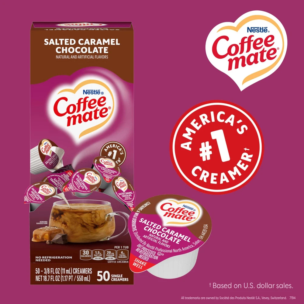 Flavored Coffee Creamer: Nestle Salted Caramel Chocolate flavor coffee creamers add a swirl of rich and creamy chocolate flavor with a touch of salted caramel to your cup of coffee Perfect for Here or On-the-Go: Stir our liquid creamer into a cup of coffee for a delicious flavor that's lactose and cholesterol-free; blends quickly and completely with hot and cold beverages Delicious Flavor You Can Rely On: Shelf stable, no refrigeration needed, retain their delicious flavor at room temperature for up to 9 months; ship and store between 50°F and 80°F Solutions for Every Need: offers liquid creamer singles, powdered creamers, liquid pump bottles, bulk creamers, and more to keep your office coffee bar and food stations stocked Dietary Benefits: Non-Dairy + Lactose-Free + Cholesterol-Free + Gluten-Free + Kosher Dairy