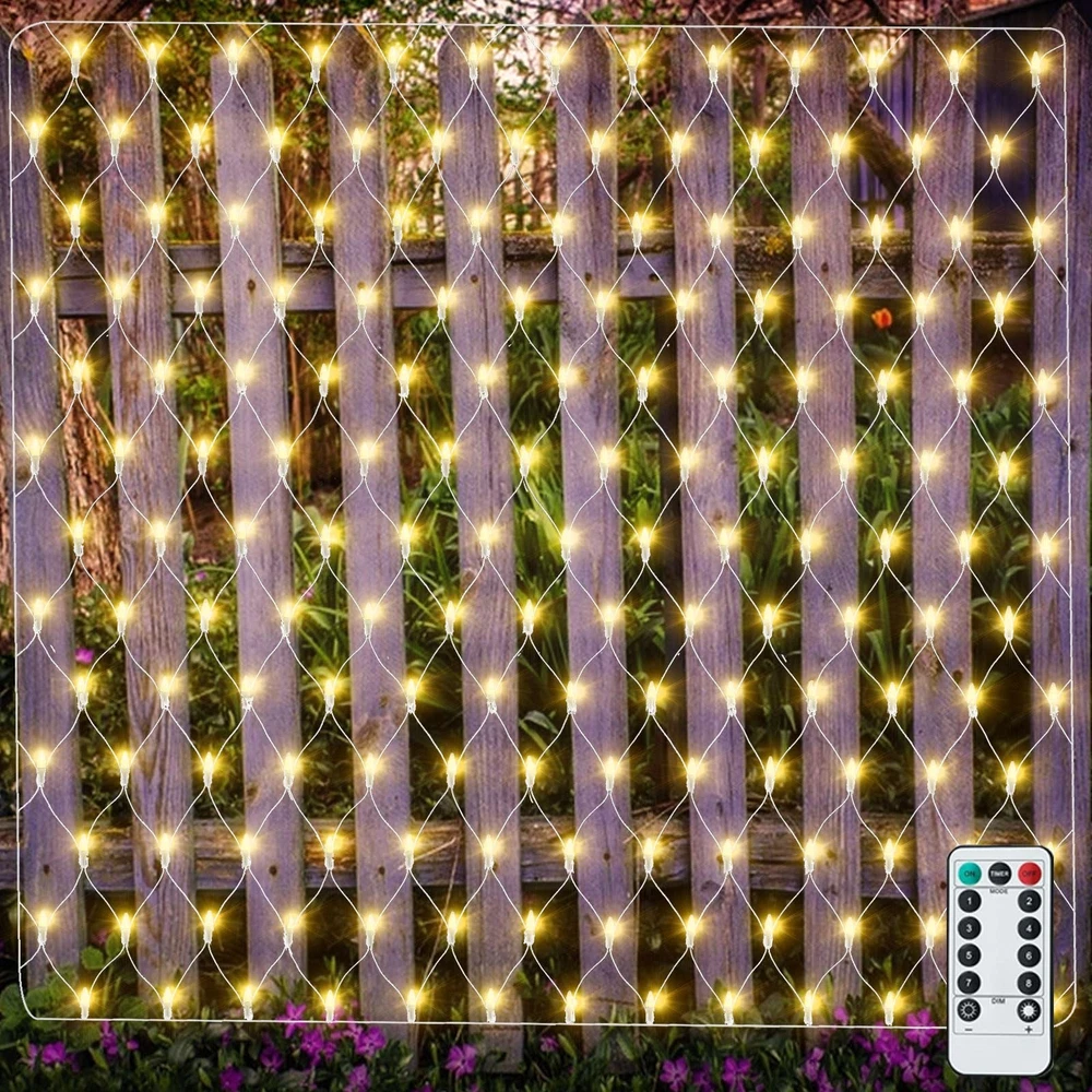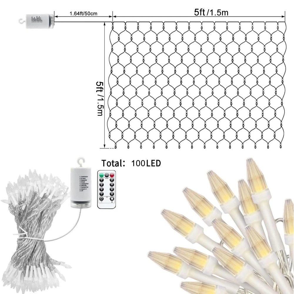 Net Lights Battery Powered for Outdoor,100LED 5FTx5FT Fairy Incandescent String Light,Net String Lights Waterproof with 8 Modes Remote Control Christmas Net Lights for Tree Bush Yard Fence Decor ✨UNIQUE APPEARANCE NET STRING LIGHT: Net lights are designed for bushes Elevate your outdoor decor with 5ftx5ft net + 150LED. Featuring a unique diamond design to improve brightness, durableness, and visual aesthetics. These net lights offer endless possibilities to suit your mood and style. ✨8 LIGHT MODES:Simply use the remote control for operation. 8 adjustable modes (combination, in waves, sequential, slogs, flash, slow fade, twinkle, and steady on). You can adjust the 4 dimmer level and 6h/8h/6639h timer as needed. ✨IP44 WATERPROOF AND DURABLE:Our net string lights are built to withstand rain or water spill with their waterproof design. Whether it's raining or snowing, these lights will continue to shine bright, adding a touch of magic and beauty to your outdoor space. ✨BATTERY-OPERATED TREE NET LIGHTS: Requires 4 AA Batteries (Not Included). Simply insert the batteries and let the magic happen. Safe and energy-efficient with battery power, the lights can be placed anywhere without the need for an electrical outlet. ✨BEST PRESENT:Outdoor net bushes lights suitable for yard, patio, balcony, wall, roof, window decoration, perfect for wedding, bushes,birthday party and Easter, Super Market, Tree and more.