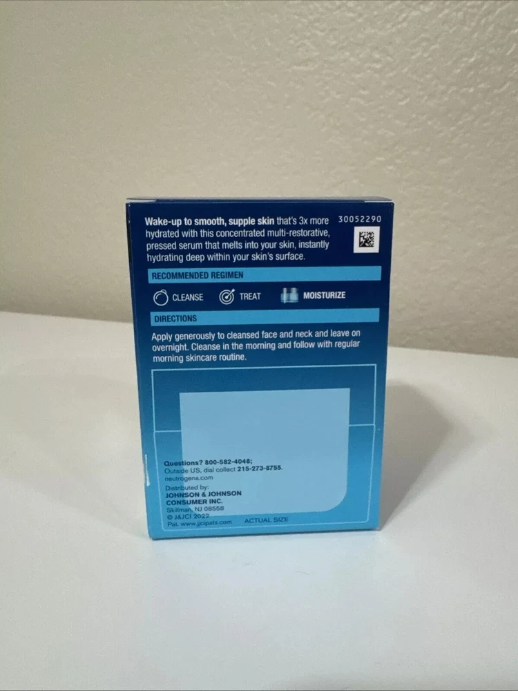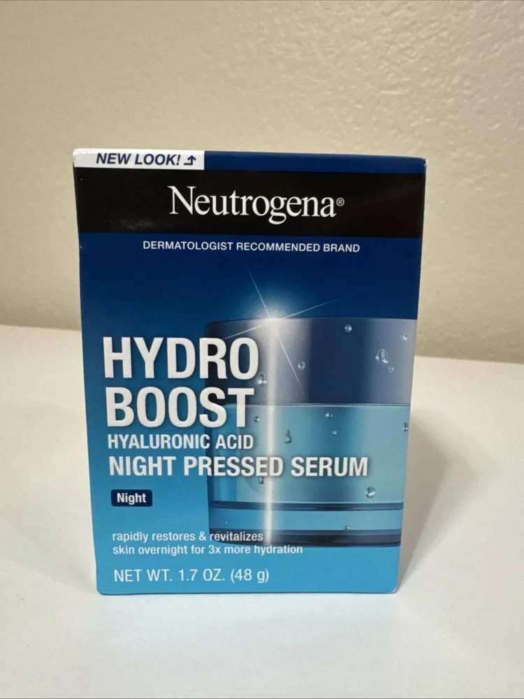 DAMAGED PACKGING Neutrogena Hydro Boost Night Pressed Face Serum delivers overnight hydration for restored, revitalized, dewy skin. The rich, hydrating pressed serum instantly melts into skin to deliver deep, lasting hydration while you sleep Ideal for normal, dry and extra dry skin types, this nighttime moisturizer is clinically-proven to deliver 48-hours of hydration and restores skin's moisture barrier overnight. Delivers 3x more hydration overnight (versus untreated skin) Hydro Boost Night Pressed Serum is formulated with dermatologist-recommended hydrating hyaluronic acid, that binds to water and holds it within skin's surface, and supercharged antioxidants, known to help fight daily aggressors Formulated with the signature Hydro Boost fragrance, this serum is non-greasy and non-comedogenic, so it wont clog your pores. Its moisturizing formula has been dermatologist-tested and formulated free of phthalates, alcohol and dye To use Hydro Boost Night Pressed Serum, apply the rich balm generously to cleansed face and neck and leave on overnight for lasting hydration. Cleanse skin in the morning and follow with your regular morning skincare routine