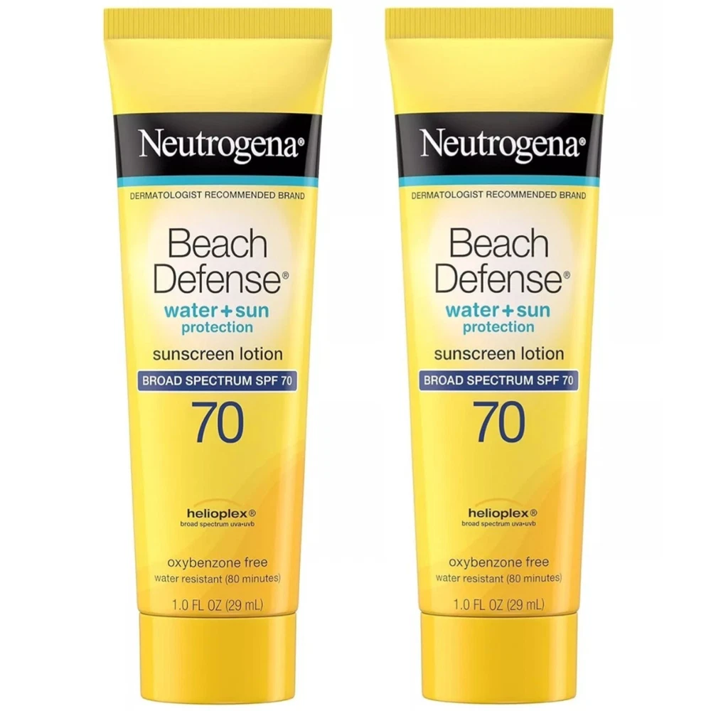 Neutrogena Beach Defense Sunscreen Lotion Broad Spectrum SPF 70, 1 Fl Oz - 2 Pk ~Travel Size~ Highlights Neutrogena Beach Defense fast-absorbing body sunscreen lotion with Broad Spectrum SPF 70 Sunscreen lotion features an oxybenzone-free formula & helps prevent sunburns when used as directed Beach-strength formula with Broad Spectrum SPF 70 that can stand up to outdoor activity Stabilized with Helioplex technology that provides superior protection against UVA/UVB rays Fast-absorbing SPF 70 sunscreen lotion formula is lightweight, oil-free and PABA-free Ideal for active families, lotion keeps skin protected against the signs of sun damage Neutrogena Beach Defense sunscreen lotion formula is water-resistant for up to 80 minutes Optimal sun protection from the #1 dermatologist-recommended suncare brand Description Help give your skin superior sun protection from harsh outdoor elements with Neutrogena Beach Defense Body Sunscreen Lotion with Broad Spectrum SPF 70. Ideal for active families, this beach-strength sunscreen lotion helps defend against the signs of sun damage and may decrease the risk of skin cancer and early skin aging caused by the sun when used as directed with other sun protection measures. Featuring an oxybenzone-free formula with Helioplex Technology, the SPF 70 sunscreen lotion offers superior broad spectrum protection from aging UVA rays and burning UVB rays. This fast-absorbing sunscreen is lightweight, oil-free, PABA-free and water-resistant up to 80 minutes. From the #1 dermatologist-recommended suncare brand.