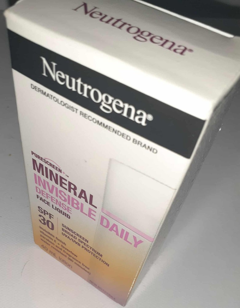 Invisible Daily Defense Face Liquid SPF 30 Neutrogena Mineral Invisible Daily Defense Face Liquid Sunscreen protects skin from sun exposure & helps fight environmental aggressors*. *that causes dry skin. This hydrating face sunscreen with SPF 30 is formulated with Vitamin E and feverfew and has an invisible finish. Comes with one 40-millilitre bottle of face sunscreen. • Help protect your skin against the sun and environmental aggressors with Neutrogena Invisible Daily Defense Sunscreen Lotion. This sunscreen with SPF 30 has a smooth, lightweight, non-chalky finish. Comes with one 40-millilitre bottle of sunscreen. • This hydrating face lotion provides broad spectrum UVA/UVB protection against sunburn and reduces risk of early skin aging*. *when combined with other sun protection measures • Formulated with feverfew and the antioxidant Vitamin E, the gentle liquid sunscreen lotion smooths on under makeup to help fight environmental aggressors such as cold, ozone, and pollution that can lead to dry skin. • Water resistant for up to 80 minutes. Adults and children 12 and older should apply liberally 15 minutes before sun exposure. The lightweight, quick-drying formula rubs in without white marks. • From a dermatologist-recommended skin care brand, this sunscreen is suitable for all skin types and tones. Neutrogena Mineral Invisible Daily Defense Face Liquid Sunscreen is paraben free, phthalates free, and fragrance free. Adults and children over 6 months of age: Shake bottle well before use ■Apply generously 15 minutes before sun exposure ■Reapply at least every 2 hours ■Reapply after 80 minutes of swimming or sweating ■Reapply immediately after towel drying ■Sun Protection Measures: Spending time in the sun increases your risk of skin cancer and early skin aging. To decrease this risk, regularly use a sunscreen with a broad spectrum SPF value of 15 or higher and other sun protection measures including: •limit time in the sun, especially from 10 a.m.- 2 p.m.; and •wear long-sleeved shirts, pants, hats, and sunglasses Other information ■Store at 15-30°C. ■may stain some fabrics