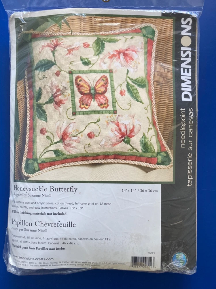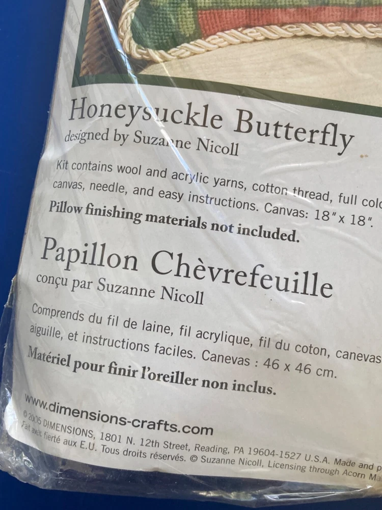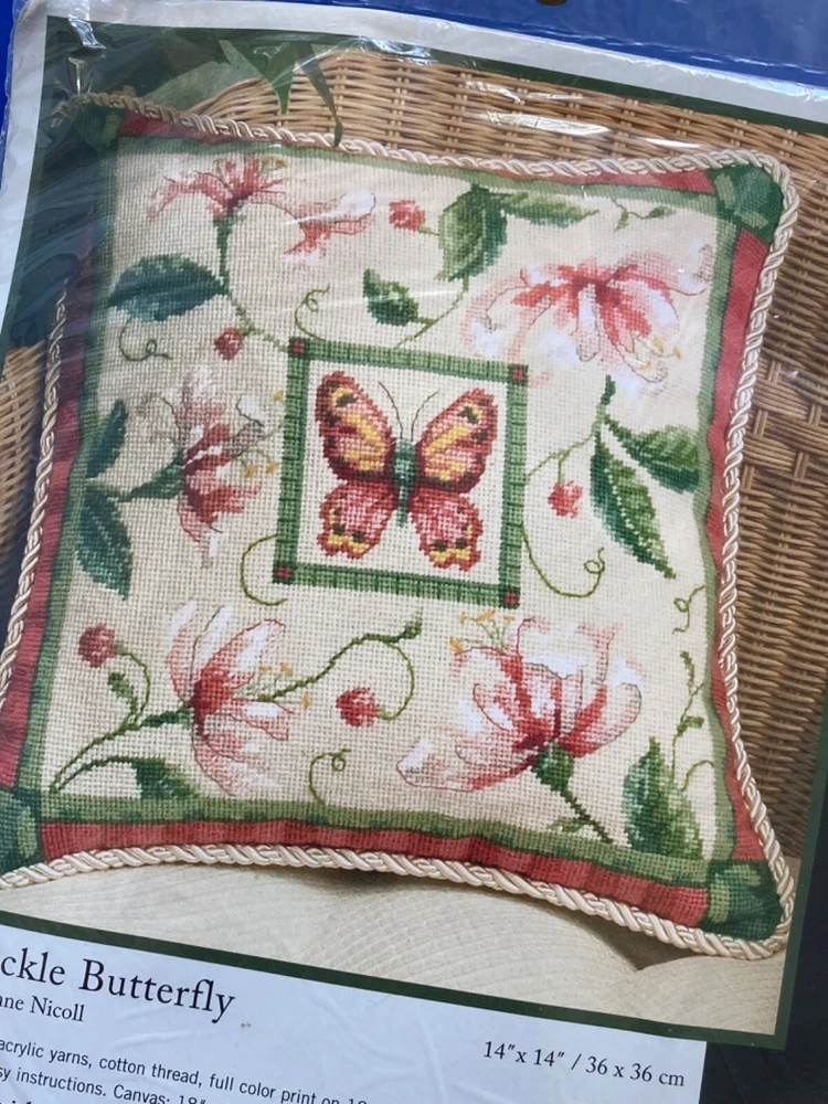A beautiful 2005 Dimensions needlepoint kit called Honeysuckle Butterfly. It is a 14” x 14”. Made in the USA. Unopened. ** There was a small hole in the bottom seam of the plastic. I taped it closed so that the needle will not fall out. Please email us with any questions and please check our Ebay store, Hooked-On-Vintage, for more great vintage items. We combine ship :-)
