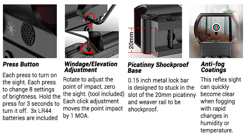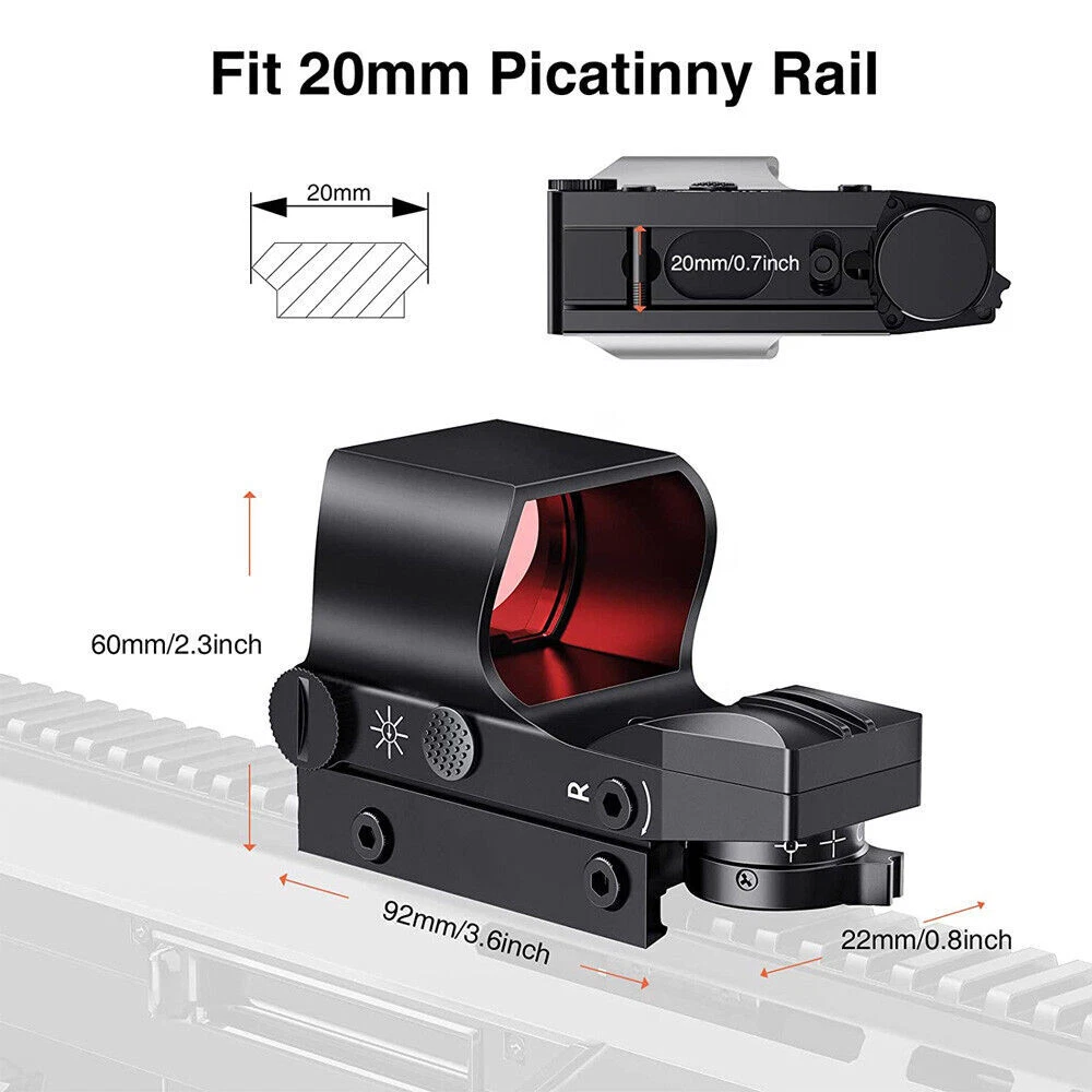 You may also like 1000X Microscope 8LED Camera Magnifier Digital for Scalp Detector Skin Analyzing 72.35 USD Free shipping 4.3'' Infrared Night Vision Rifle Scope Hunting Sight recordable Camera IR Torch 137.15 USD Free shipping 5000rpm Mini Electric Table Saw Adjustable Speed Angle Desktop Circular Cutter 162.85 USD Free shipping Boxing Training Music Electronic Boxing Wall Target Combat Smart Bluetooth APP 140.39 USD Free shipping IR Night Vision Rifle Scope Video Record Hunting Tool Optical Sight Camera 850nm 209.21 USD Free shipping Shockwave Decepticon BAIWEI TW1028 Simplified Version Deformabl Robot 200mm Toys 41.67 USD Free shipping New 48L Motorcycle Top Box Rear Storage Luggage Scooter Tail Box Waterproof Case 285.76 USD Free shipping New Wireless Guitar Transmitter Receiver Audio System 6.5/3.5MM Plug 2.4Ghz ISM 59.39 USD Free shipping 1080P IR Night Vision Monocular 5X Zoom Telescope Hunting Digital Camera &Tripod 146.57 USD Free shipping Universal Belt Pulley Geared Motor Low Noise Geared Motor High Torques 12V 250W 146.57 USD Free shipping New USB Powered Massager IR Vibration Heating For Shoulder hip bone Pain Relief 125.27 USD Free shipping Spinal Air Traction Back Belt Decompression Lumbar Waist Heating Brace Support 106.91 USD Free shipping Beauty SPA Tool Facial Skin Peeling Oxygen Water Spray Jet Hydro Exfoliating 125.27 USD Free shipping Cold Laser Red Light Infrared Therapy Device Muscle Arthritis Pain Relief 808 nm 194.39 USD Free shipping New 20mm Rail Tactical Red Dot Sight Holographic Reflex Scope for Hunting Rifle Product Feture 【More Accuracy】 Fully multi-coated red lenses of our reflex sights enhance image clarity and increase light transmission during low light situations. The 40mm reflex lens with tubeless design provides a wider field of view (15.8m@100m), parallax corrected & unlimited eye-relief, improving the accuracy of holographic sights. 【4 Tactical Reticle Options】 Illuminated reflex sights with 4 bright reticle selections provide various choices to meet different occasions. Red-Dot, Circle/Dot, Crosshair/Dot and Crosshair/Circle/Dot combinations are all in one sight, co-witnesses with your existing metal sights. 【8 Brightness Settings】 With 8 levels of brightness adjustment, red dot sight can be adjusted to fine tune your eyeshot from sunlight to dusk. The push-button design makes brightness adjustment easier. Press the button for 3 seconds to turn it off. 【Easy to install】 Reticle sight with standard 20mm mounting base installs conveniently on the picatinny rail, using included Allen wrenches. Compact battery compartment makes battery replacement easy. 【Durability】 This open reflex red dot sight with precise windage and elevation adjustments is easy to zero and holds zero well, enduring repeated use. Note: This item has a wake-up function. If it remains stationary for 4 minutes, the light will automatically turn off, Mainly used in response to unexpected situations, picking up the sight does not require turning it on again and returns to its last use state. Parameter Style: Tactical Material: Aluminum Mounting Type: Picatinny Mount Obj. Aperture: 28mmx40mm Magnification: 1x Field of View: 15.8m@100m Eye Relief: Unlimited Finish: Black Matte Dimensions: 92x43x60mm/3.6x1.7x2.3in Dot Color: Red Reticle Type: 4 Different Reticle Patterns Battery Type: 2x batteries (included) Note: This item has a wake-up function. If it remains stationary for 4 minutes, the light will automatically turn off, Mainly used in response to unexpected situations, picking up the sight does not require turning it on again and returns to its last use state. Package includes: 1x Red Dot Sight 2x Battery 2x Allen key 1x Cloth