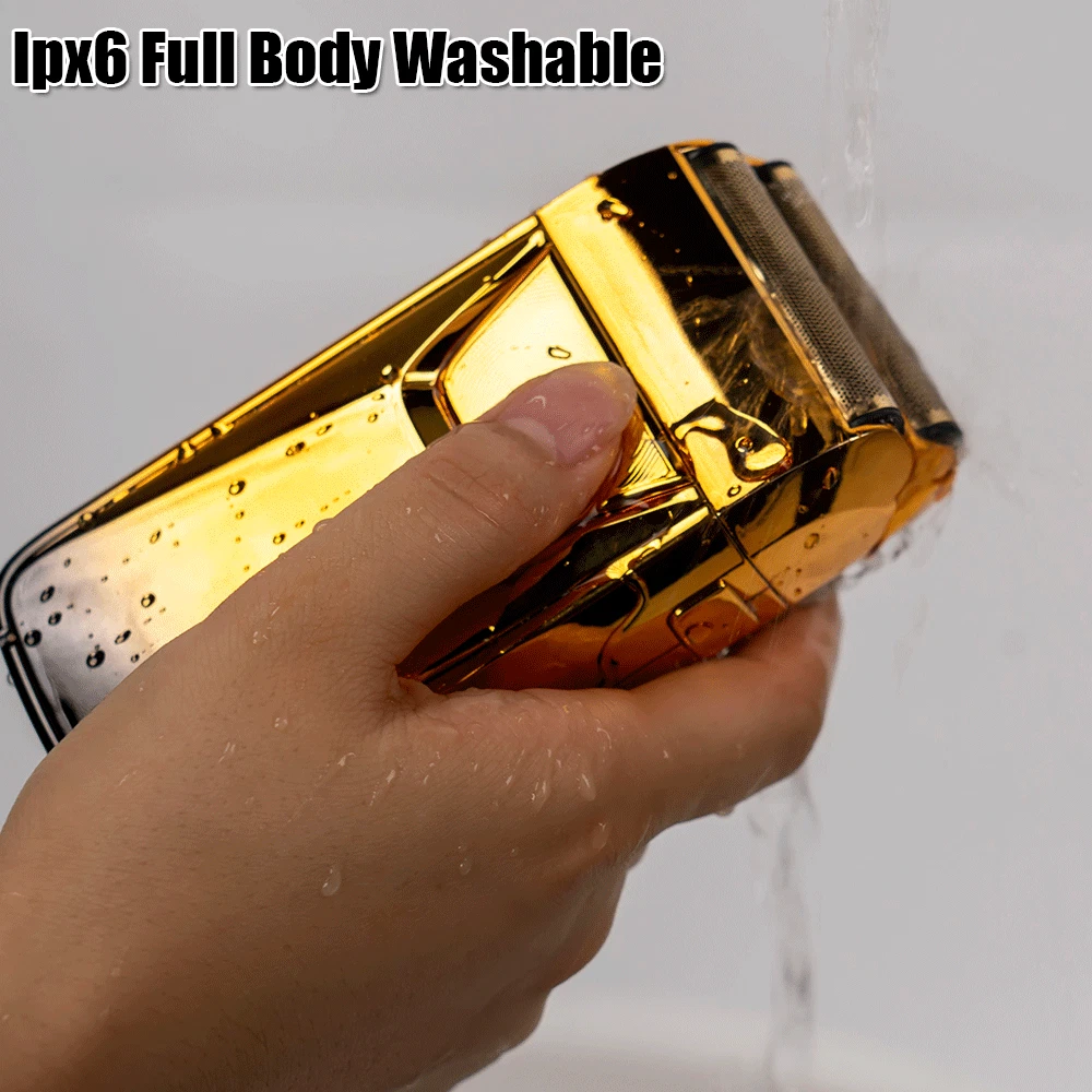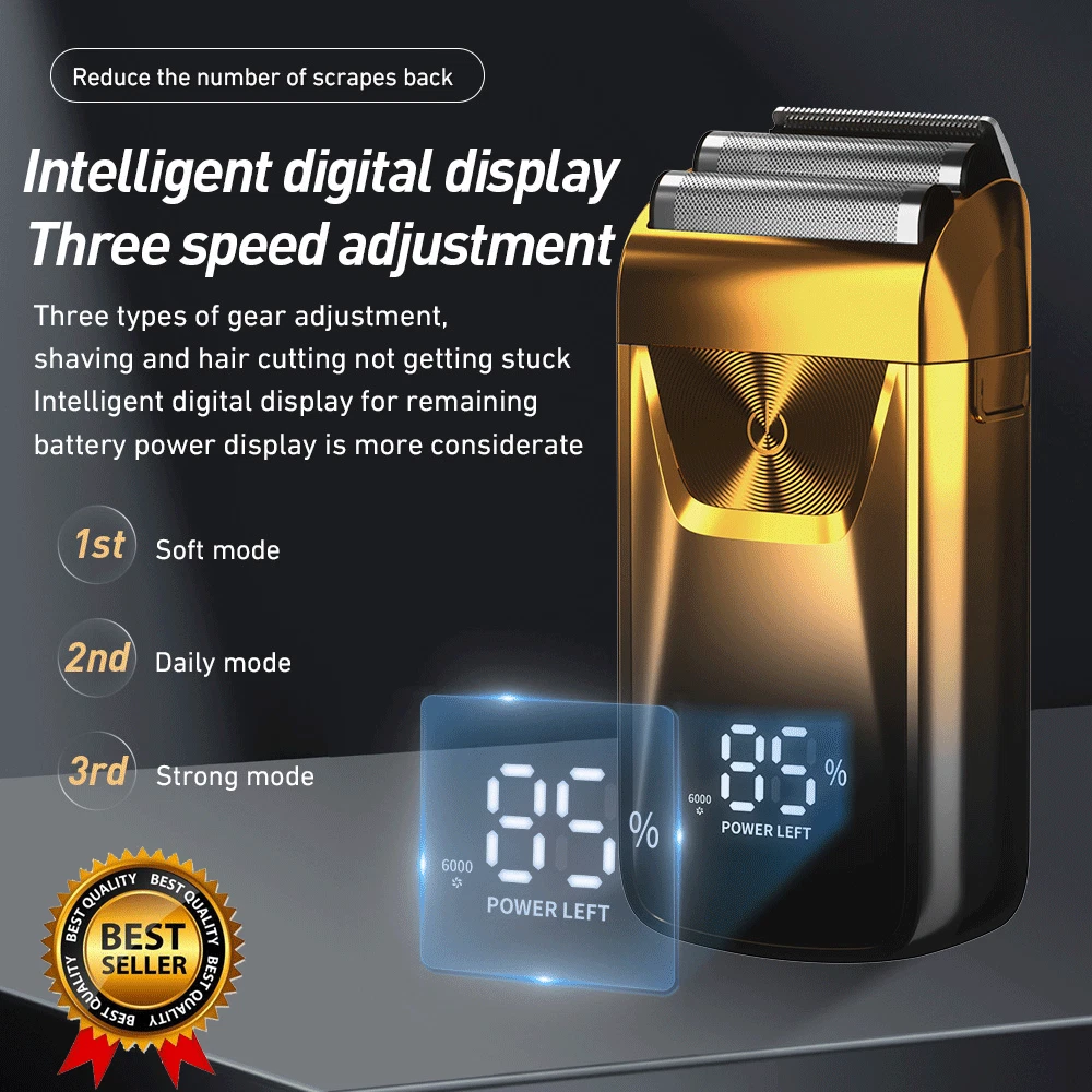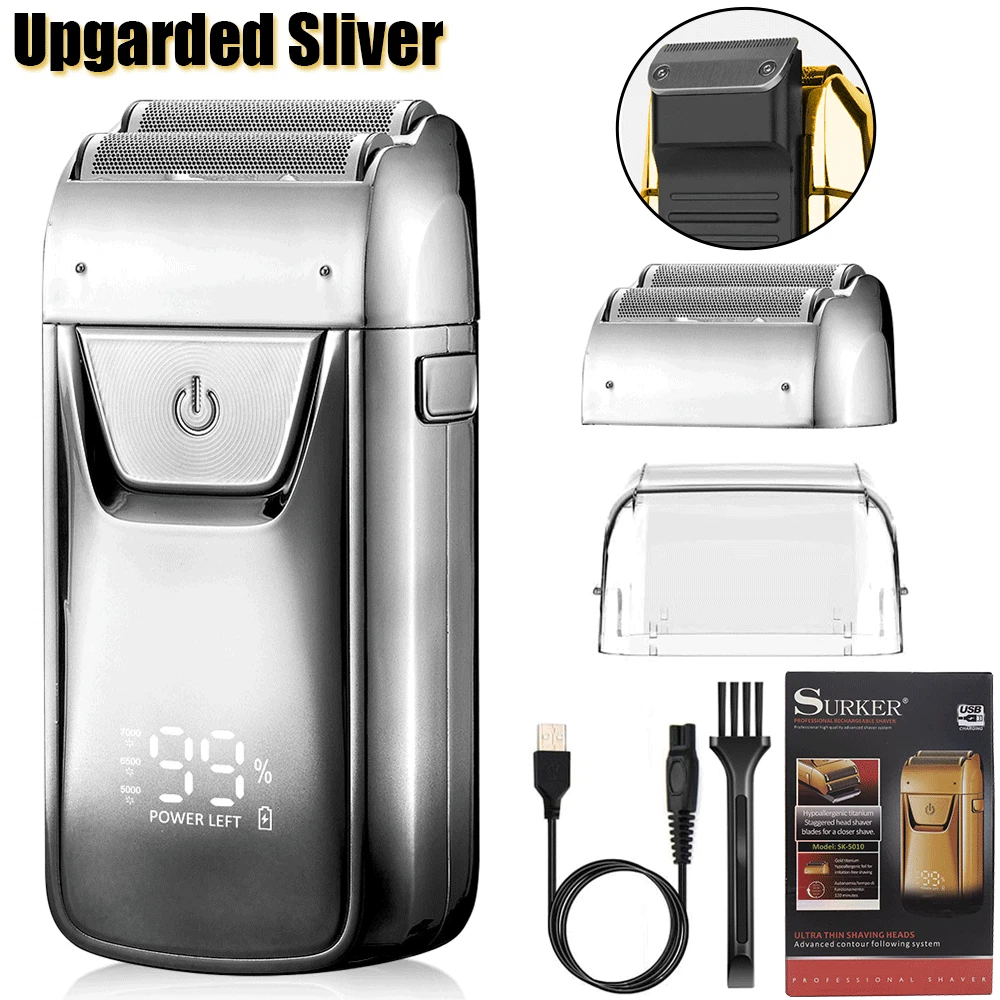 Description ★ Foil shaver: Easily and comfortably trims face, neck and chin. Safe and clean without hurting the skin. ★ Speed: The shaver has 3 speed adjustments. 6 500RPM at most. Give you a quick shave. ★ Pop-up trimmer: Easily and quickly trim longer beards and sideburns for you. Leaves your face refreshed and cleansed. ★ LED: The LED display clearly shows the remaining percentage of the battery. Reminds you to recharge your hair shaver. ★ Battery power: The shaver has a built-in 1 4 00mAh battery, which can be used for up to 1 2 0 minutes after charging for 2 hours. Product Details : Material: ABS Color: Gold /Sliver Power: 5 w Charging Time: 2 Hours Use Time: 120 Minutes Battery: Lithium Battery 14 00mAh Size: Approx. 12x6x3.8cm / 4.7*2.3*1.5inch What You Get : 1 * Men's Shaver 1 * Spare Shaving Head 1 * USB Charging Cable 1 * Clean Brush 1 * Protective C over 1 * Instruction manual