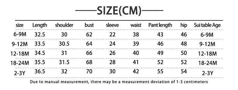 Name: Autumn Winter Baby Pants Set ⭐Set type: long sleeved+long pants ⭐Gender: Neutral ⭐Season: Autumn ⭐Occasion: Home/Leisure Please note that: 1. There is a difference of 0-3 centimeters in manual measurement. Before purchasing this product, please carefully check the measurement chart. 1 centimeter=0.39 inches 2. Please note that slight color differences due to lighting and screen are normal. If there are any quality issues with the product, please feel free to contact us and we will help you solve the problem as soon as possible.
