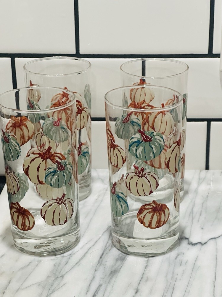 This set includes 4 Greenbrier International drinking glasses, each with a capacity of 16 oz. The glasses are decorated with a fall-themed pumpkin design in shades of orange, blue, and beige, making them perfect for adding a festive touch to your table setting during autumn. Made of glass, these drinking glasses are ideal for serving beverages to guests or enjoying a refreshing drink on your own. These pumpkin-themed glasses are a stylish and seasonal addition to your dining collection.