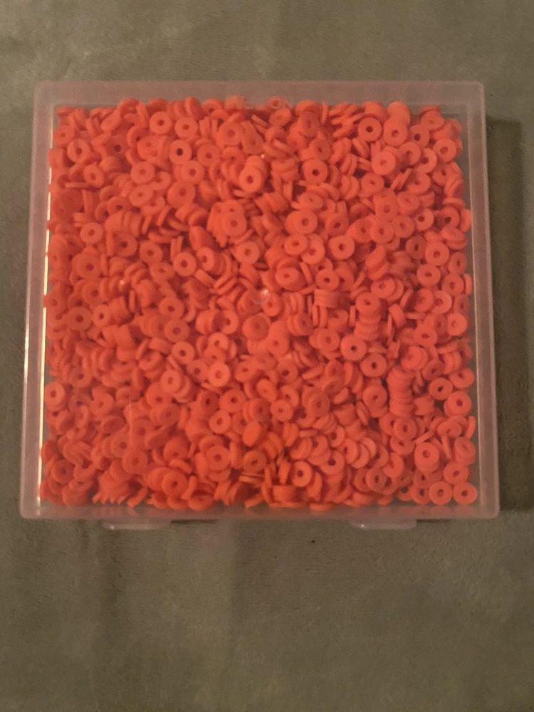 The product is a set of new 6mm vinyl heishe polymer clay African rondelle beads in an orange-red color. The beads have a 2mm hole size and are made of clay material. They are shaped like rondelles and each bead measures 6mm in size. Ideal for crafts and jewelry making projects.