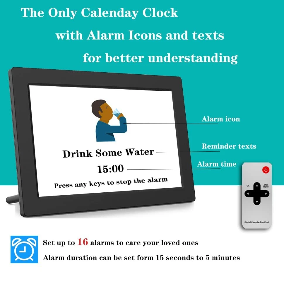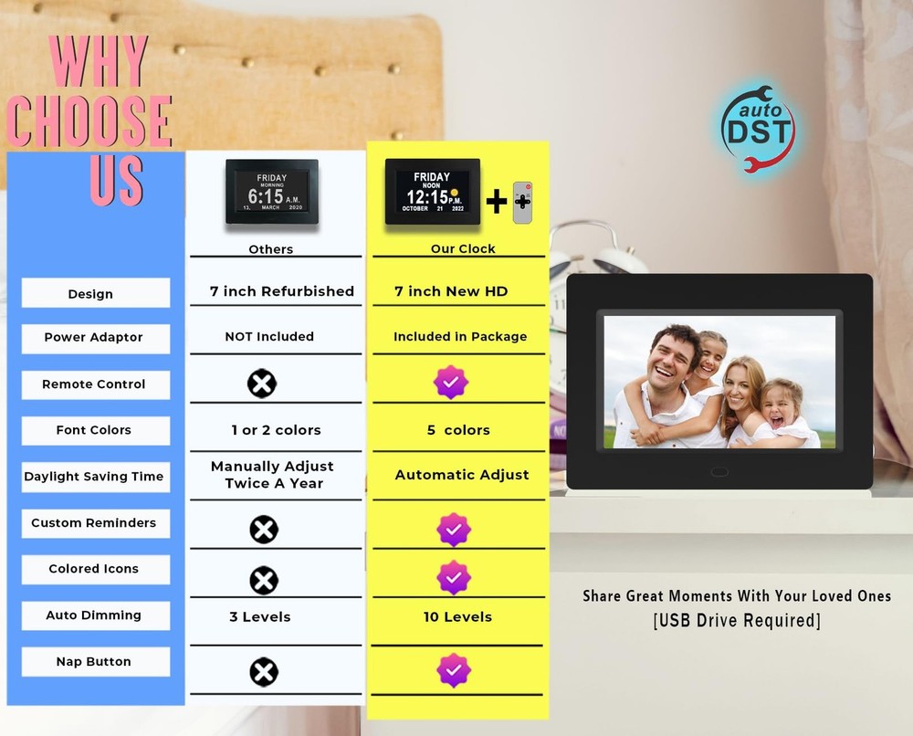 【Best Clock for Seniors or Schoolkids】1280x800 HD Calendar Clock clearly spells out the time, period of the day- no confusing abbreviations! Convenient with remote control and thoughtfully designed themes make this clock ideal for seniors or vision impaired! A nap/sleep button and auto night-dimming is perfect for the midday naps or night sleeps! By display BEFORE DAWN after MIDNIGHT minimizes the problem of seniors getting up & start the day in the wee hours. ✔ BEST CLOCK FOR SENIORS: The high resolution 7 inch digital alarm clock clearly spells out the full DAY of the WEEK, MONTH and DATE, also shows MORNING, AFTERNOON, EVENING, NIGHT, MIDNIGHT & BEFORE DAWN. By displaying BEFORE DAWN after midnight minimizes the problem of seniors getting up & start the day in the wee hours. ✔ Multiple Alarms & Custom Reminders: This digital clock with day and date for elderly comes with reminders of medication and drinking water, and you can custom reminders for your loved ones.It's a great aid to the seniors with dementia or Alzheimers. ✔Auto DST & Time Reset: Our calendar clock is the only one to include Daylight Saving Time, which will automatically adjust time in March and December. The day clock is electric and plug-in-outlet, but it has an internal battery which helps reset time if the power is disconnected. ✔ Easy to Set & Quiet for Sleepers: Our day calendar clock has only 7 buttons and simple setting interface, easy to set for the elderly. The clock has a nap button when you need to take a nap. No ticking sound GREAT for the seniors to get a deep sleep. ✔ Auto-Dimming Options & Multi-Colors: Our calendar clock will auto dim from 8 pm to 6 am to help save energy and protect eyes. You can also adjust brightness levels and text colors (White/Yellow/Green/Orange). Tips: Green and Orange texts have lower contrast than White and yellow, especially during the night time. ✔ Warranty & Support - The words Dementia, Alzheimer's and Memory Loss are intentionally excluded from the packaging, great gift for the seniors or schoolkids. We stand behind the durability of our goods and offer an unconditional 12 months guarantee. This day clock has everything you're hopeing for, So Add It To Your Cart Now !!! **About Battery - our clock is electric (cord included), but has an internal battery which helps automatically save setting in case of power outage.