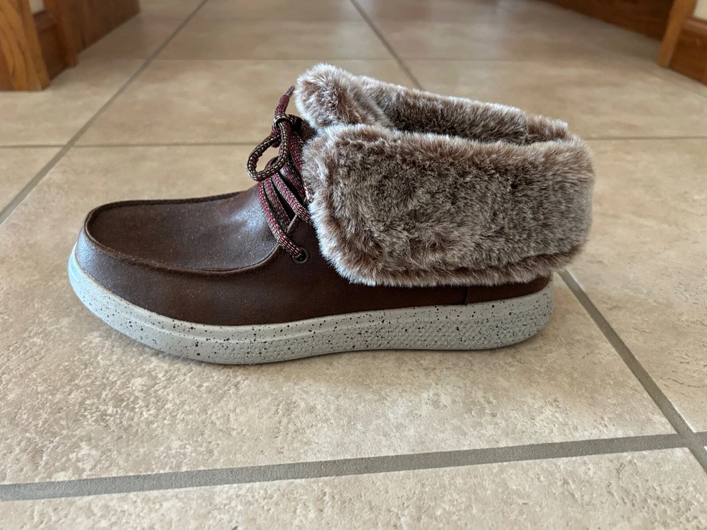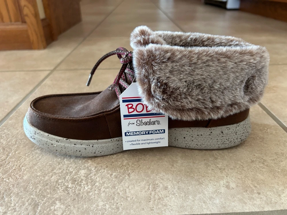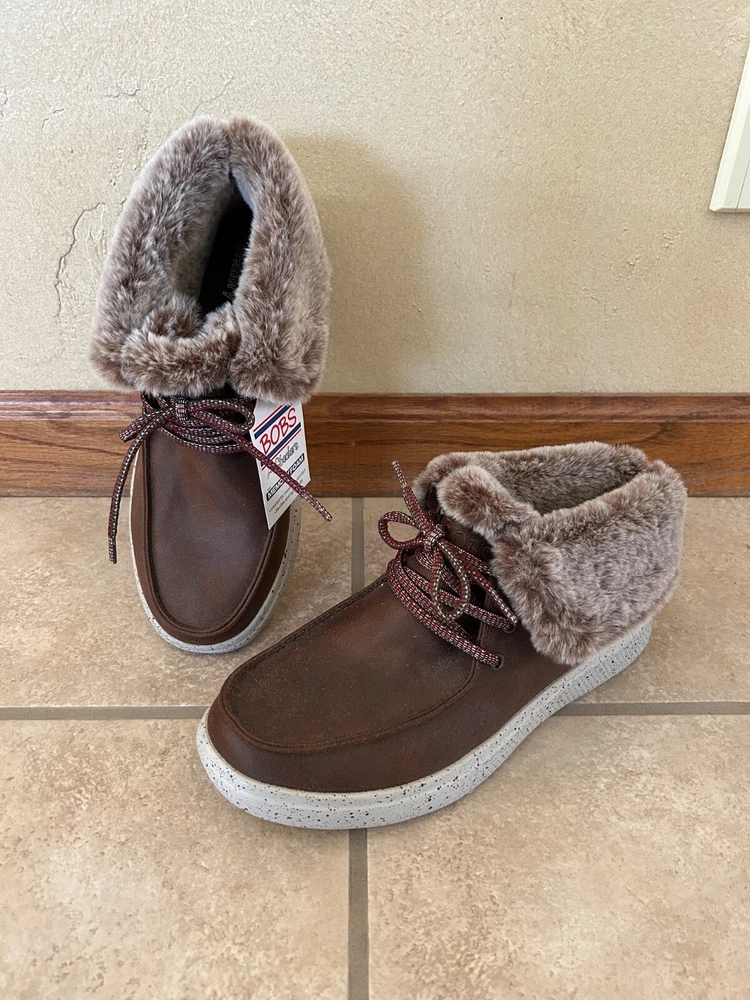 You will be both in style and dressed for comfort with these Skechers Women's BOBS Skipper Hang Glider Boots in brown. The listing is for women's size 9. Designed with a smooth leather-textured microfiber upper material and a lace-up ankle boot design with a moc toe, these boots are perfect for any occasion. The plush faux-fur fold-down collar adds a touch of elegance,w hile the rubber outsole provides great traction and durability. These ankel boots feature a chenille lining, cushioned midsole with speckle color details, and memory foam insole for extra comfort. The low heel height and flat heel style make them perfect for walking or standing for long periods of time. With a solid pattern and accents like fur trim and logo, these boots are sure to make a statment. Don't miss out on this great addition to your shoe collection. Please note: Items are from smoke-free and pet-free home. Alaska & Hawaii residents - please contact me for shipping quote, as shipping is usually a little higher than to the 48 contiguous states. International buyers - Please note: Import duties, taxes and charges are not included in the item price or shipping charges. These charges are the buyer's responsibility. Please check with your country's customs office to determine what these additional costs will be prior to bidding/buying. Track Page Views With Auctiva's Counter