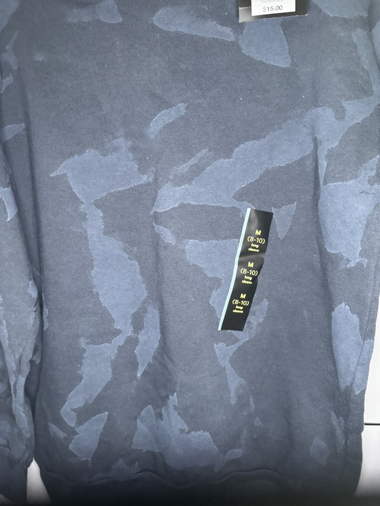 This NWT boys' sweatshirt by art class features a dark blue camouflage pattern, making it perfect for casual wear or outdoor activities. The pullover style sweatshirt has long sleeves and a crew neck, providing a comfortable fit for a size M 8/10. Made of a cozy fleece fabric blend of polyester and cotton, this sweatshirt is ideal for the winter, fall, and spring seasons. The design is themed around an army look, suitable for boys who enjoy a rugged and adventurous style.