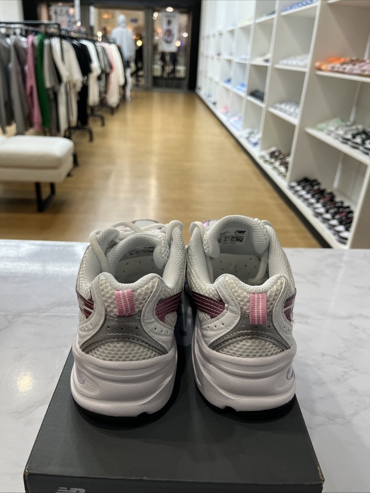 The product is a pair of New Balance 530 sneakers in a size 4 for men. They come in a Pink Sugar colorway and are in great pre-owned condition. The style code for these sneakers is MR530PK, featuring a mesh upper material that provides breathability and comfort. Part of the New Balance 530 product line, these sneakers offer a classic and stylish look perfect for athletic or casual wear in 2024. OGALL!
