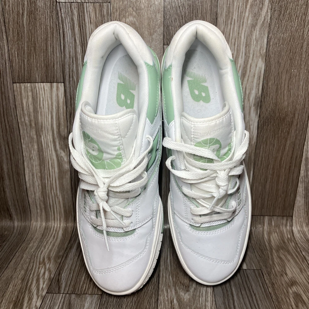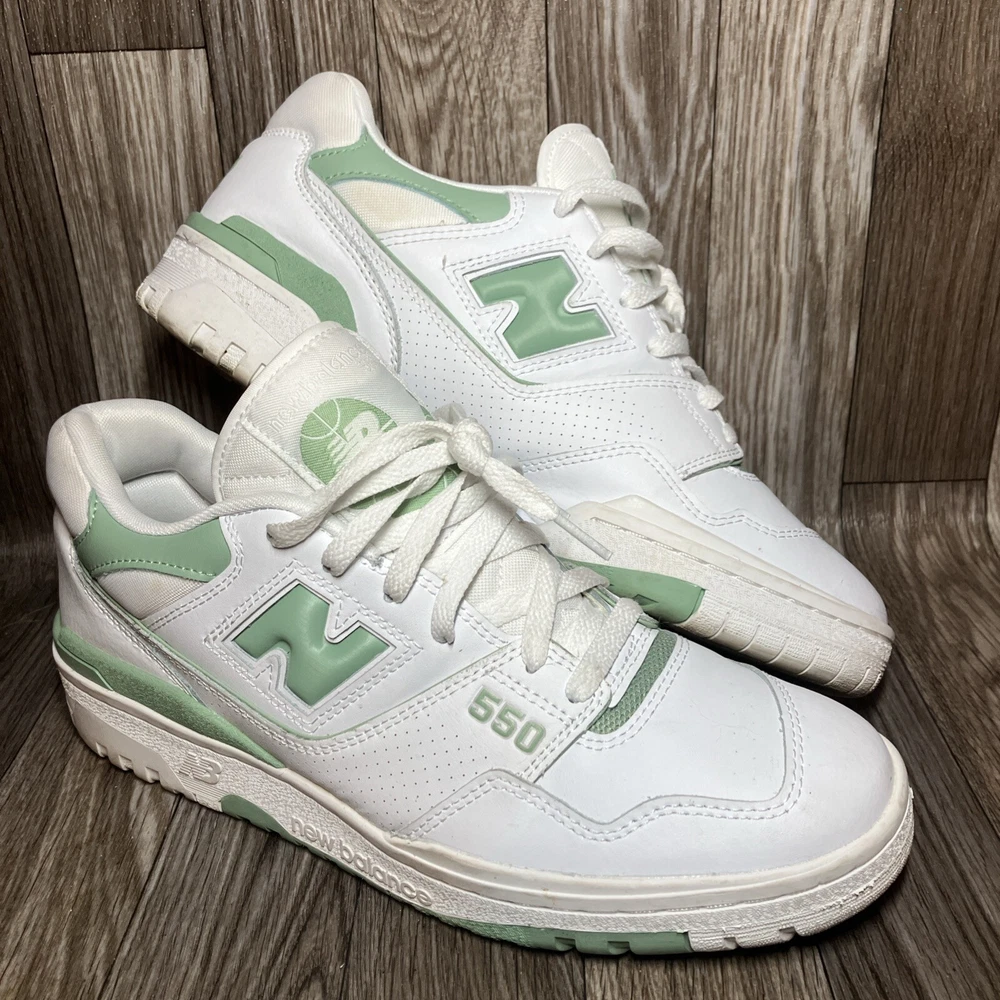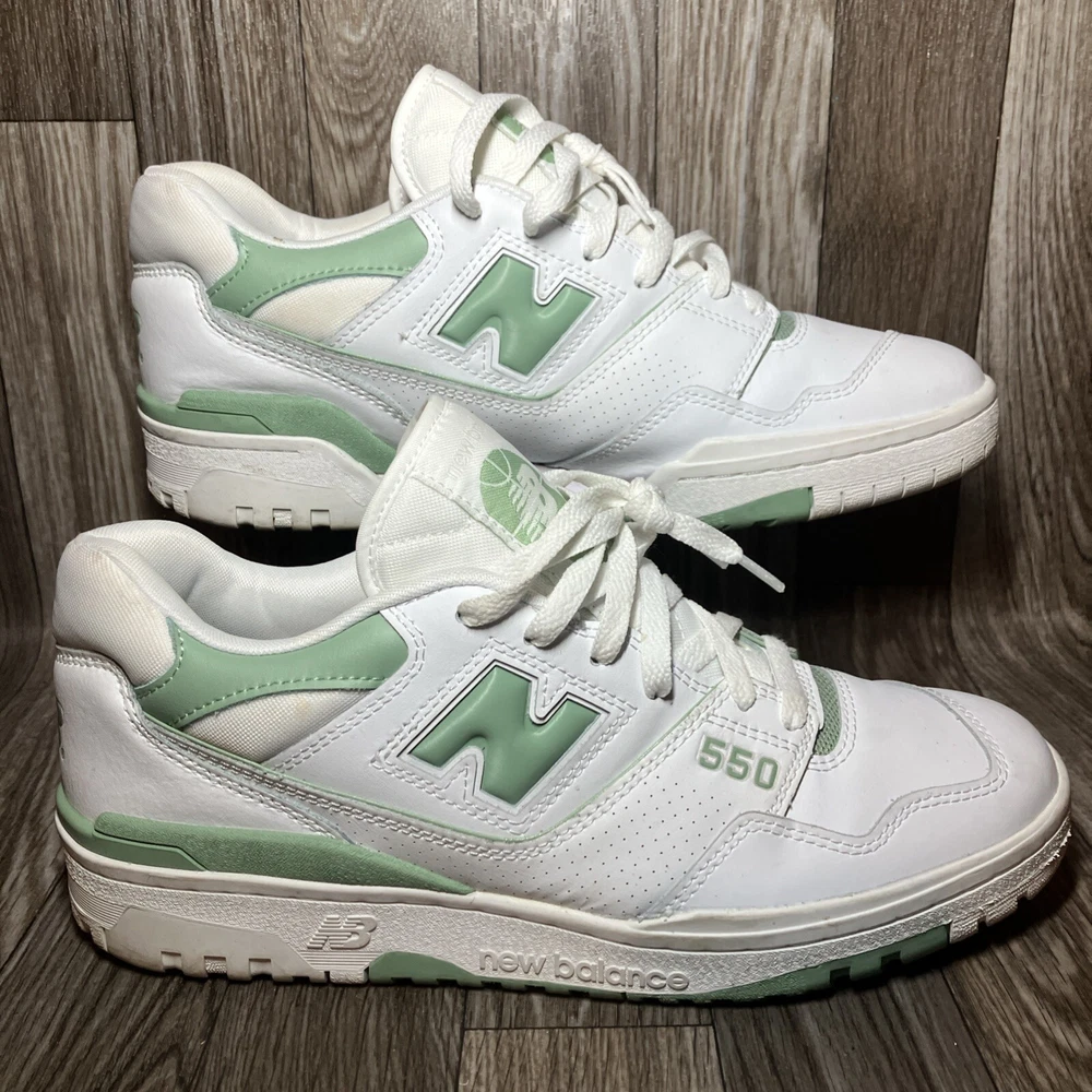 These New Balance 550 sneakers in white and mint green are a perfect addition to your shoe collection. Designed for men, these athletic shoes have a lace-up closure and a low-top shaft style. The cushioned and comfortable features make them suitable for various occasions, including activewear, casual, and workwear. These sneakers have a style code of BB550FS1 and were manufactured in Vietnam in 2022. They are perfect for walking, school, running, and jogging. The upper material is made of leather, and the shoes are available in size 11 with a D width. The nickname of these sneakers is "White Mint Green," and they are part of the New Balance 550 product line.