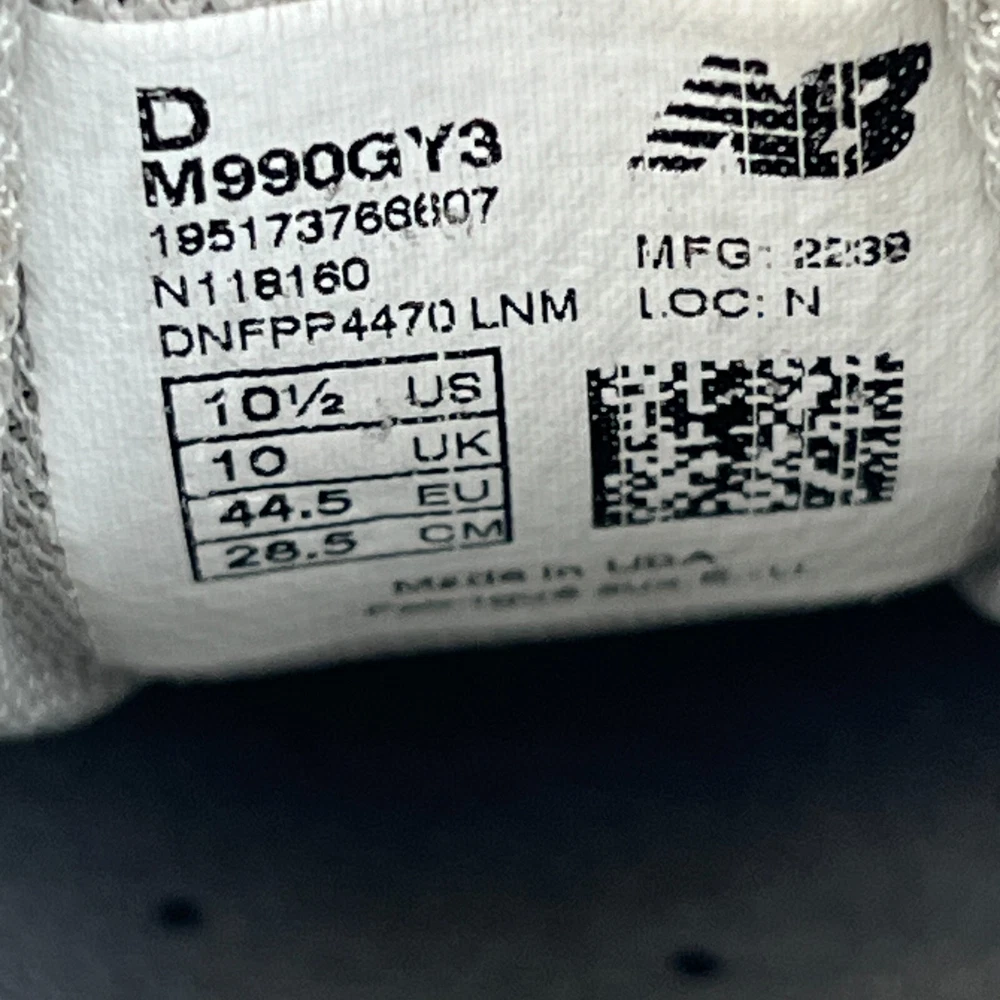 Customized: No Pattern: Solid Features: Breathable, Comfort, Cushioned Performance/Activity: Gym & Training, Running & Jogging, School, Walking Department: Men Brand: New Balance Model: New Balance 990v3 Shoe Shaft Style: Low Top Country/Region of Manufacture: United States EU Shoe Size: 44.5 UK Shoe Size: 10 Type: Athletic Style Code: M990GY3 Shoe Width: Standard Season: Fall, Spring, Summer, Winter Color: Gray Seller Notes: “Pre-owned No rips, holes, or tears. Smoke-free. No box. See all photos for exact condition.” Style: Sneaker US Shoe Size: 10.5 Closure: Lace Up Vintage: No Product Line: New Balance 900 Series Upper Material: Suede