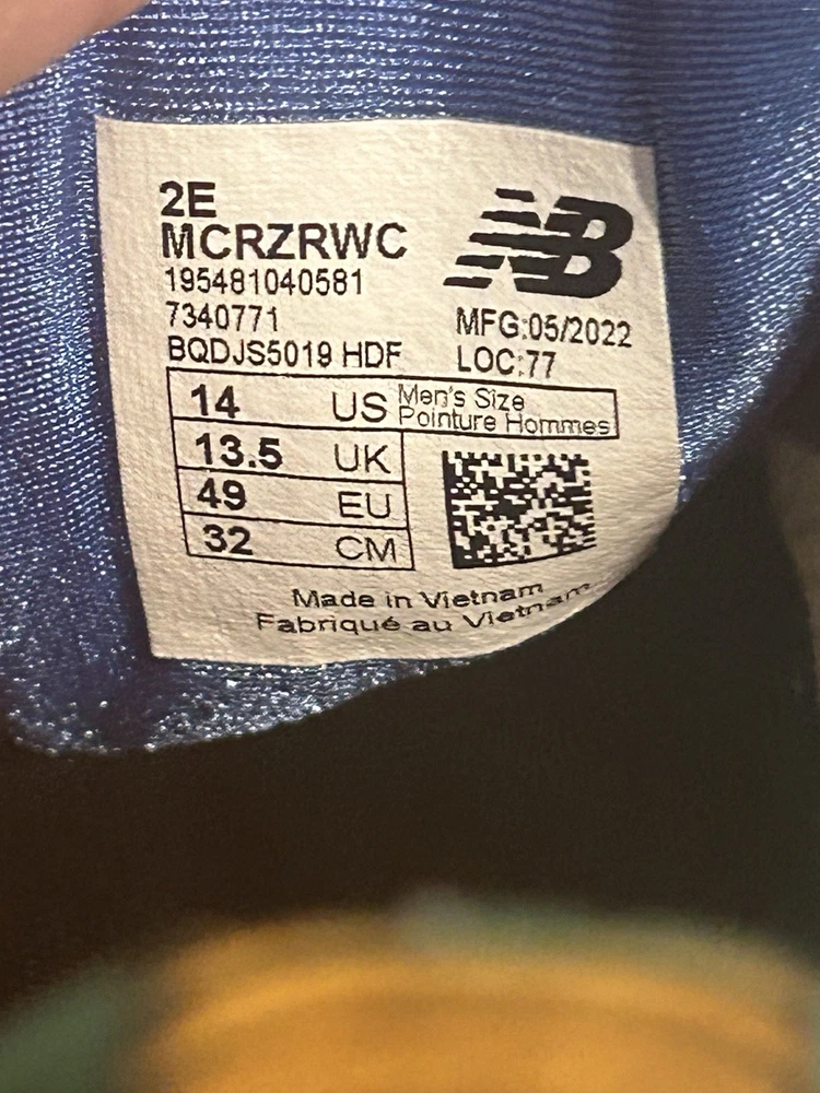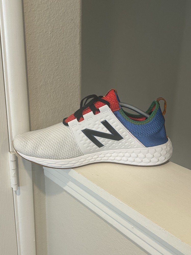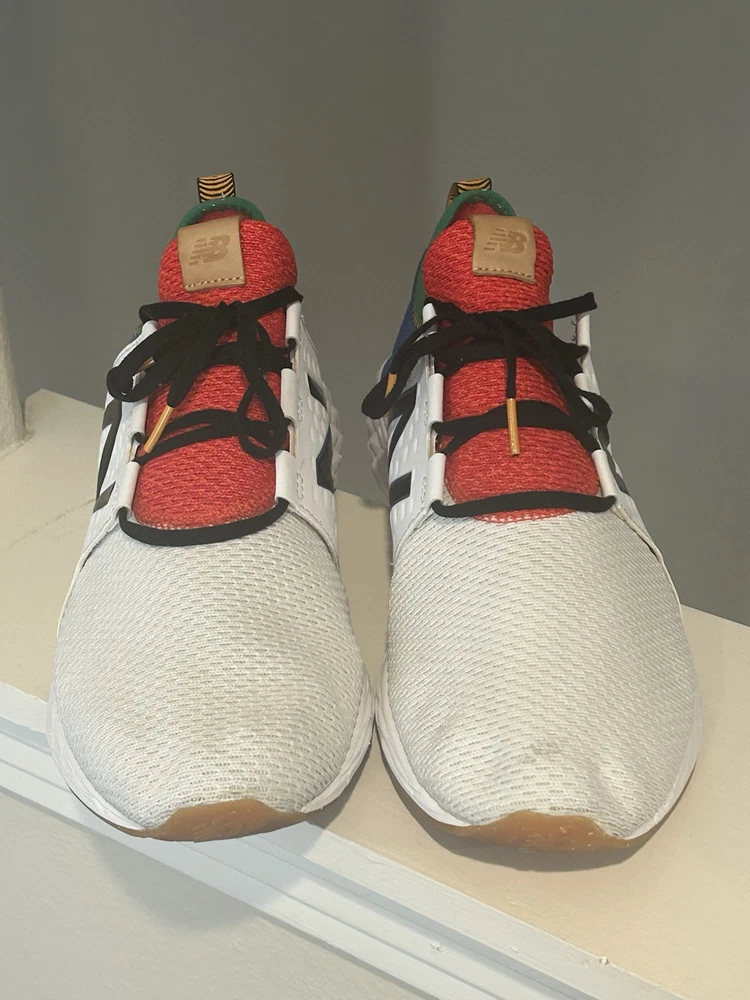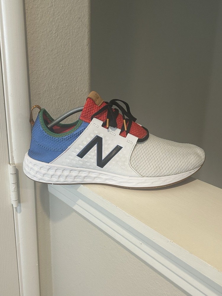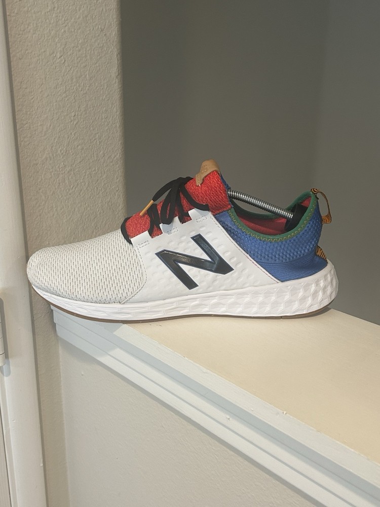 This is a New Balance Cruz Reissue sneaker in white, red, and blue, designed for men in size 14 2E. It features a lace-up closure, low-top shoe shaft style, with a synthetic upper material and rubber outsole. The shoe offers comfort, breathability, and performance, suitable for casual wear in all seasons. The design is colorful and sporty, part of the New Balance product line with a style code of MCRZRWC.
