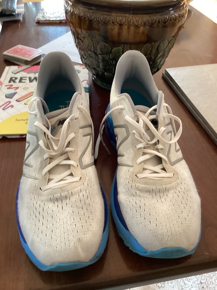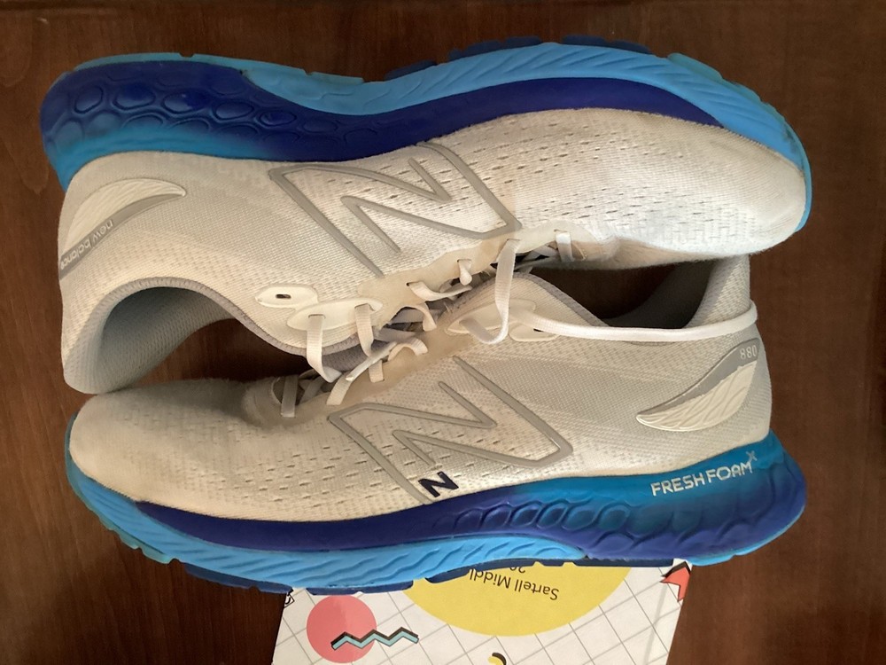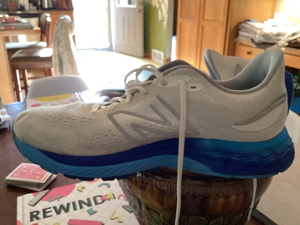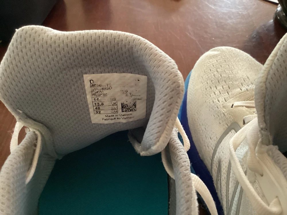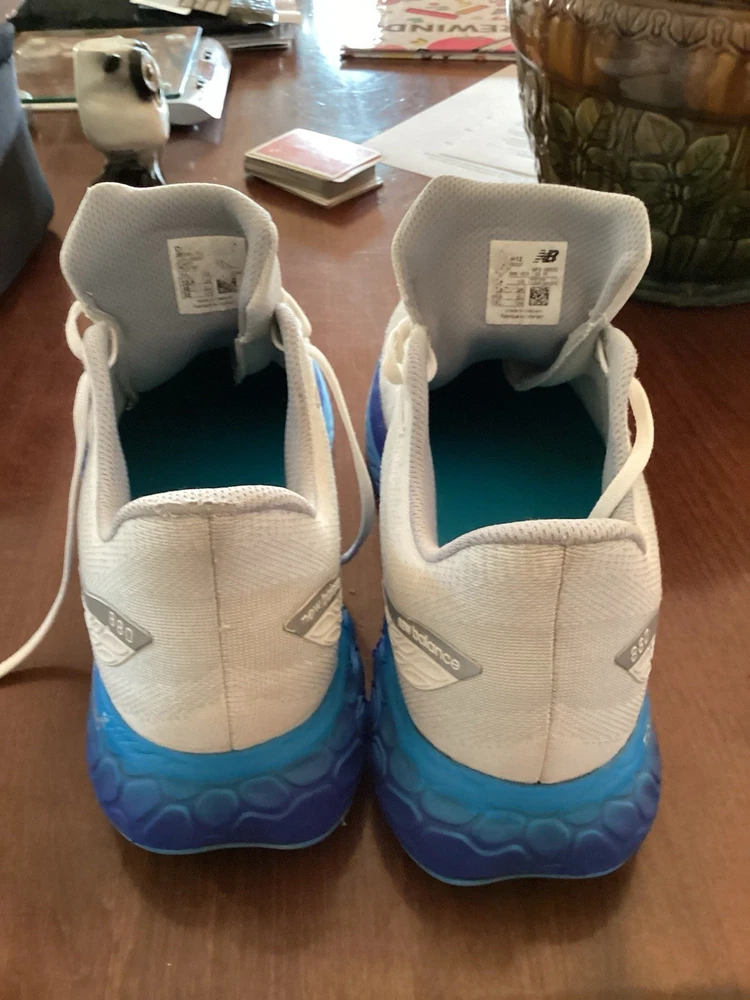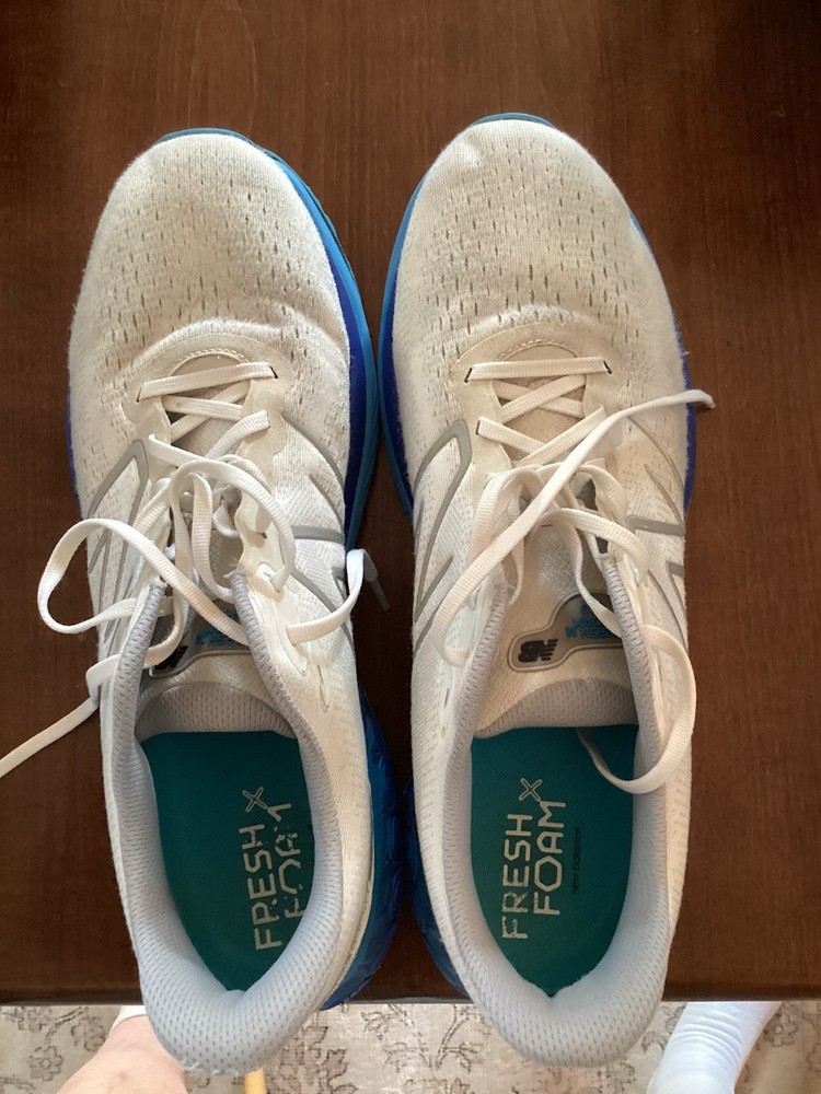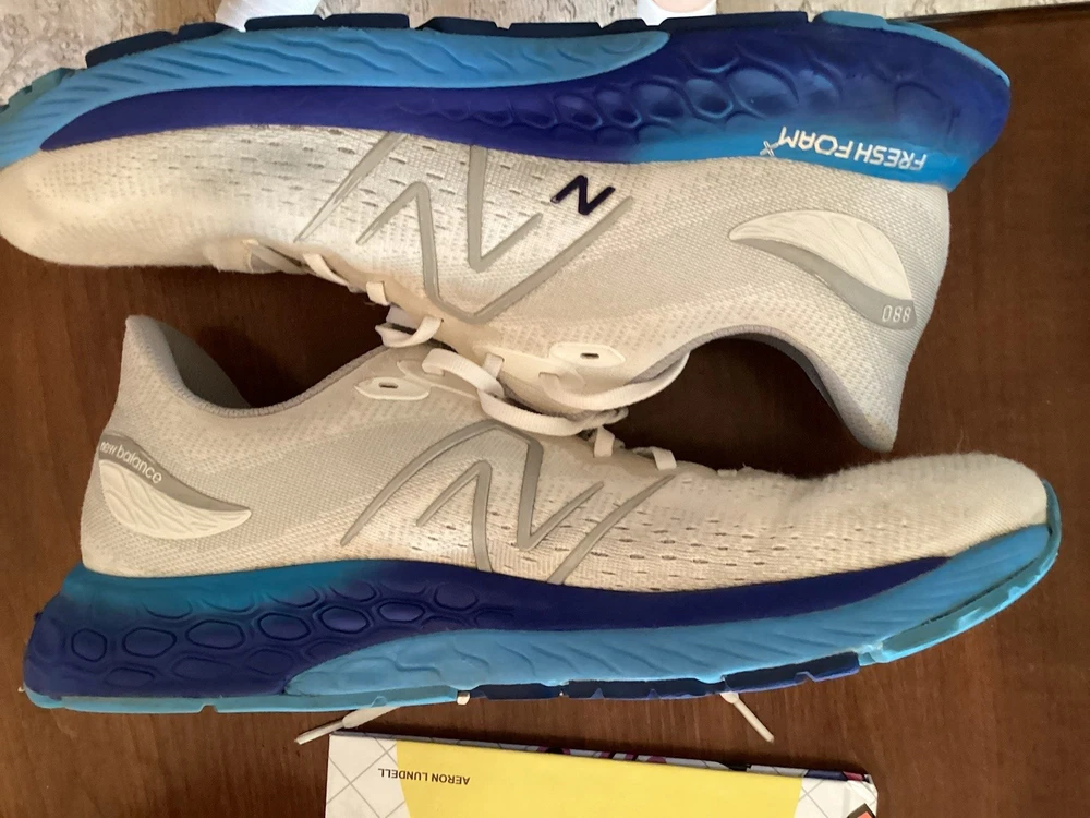 The New Balance Fresh Foam 880 v12 Men’s Shoes in size 14 are a stylish and comfortable athletic option for men. Featuring a low top shaft style and lace-up closure, these sneakers are designed for activewear and casual occasions. The white and blue color combination, along with the cushioned and breathable features, make them suitable for various seasons and activities like gym training, cross-training, and running. With a sturdy synthetic upper material and a D shoe width, these New Balance shoes provide stability and support for all-day wear in 2022. Shoes are worn as shown in detail in the photos. The actual white color has darkened/faded with use. Good shoes for walking, jogging, running. Quality from New Balance. Don’t miss these hot kicks at a nice price! Cocoa approved :)