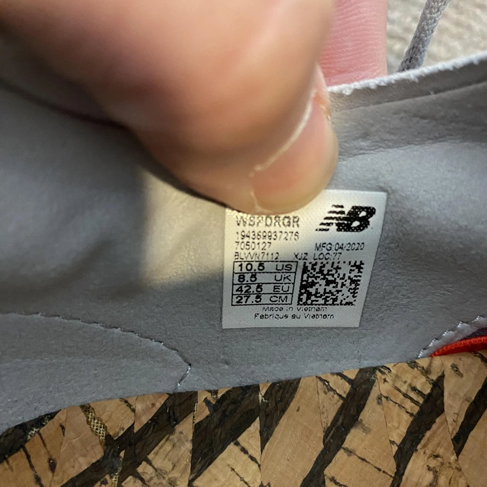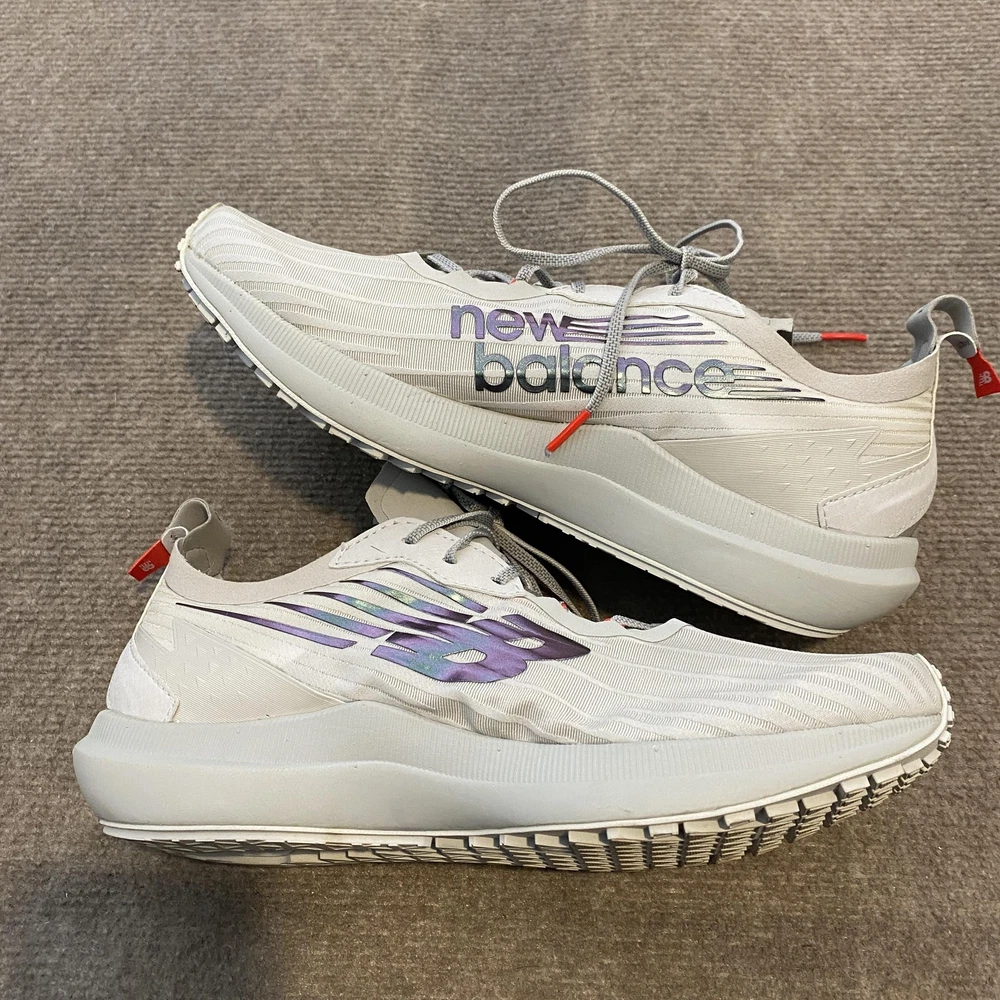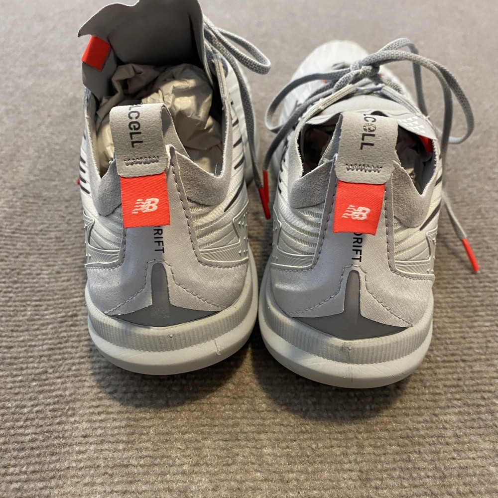 Pre-owned pair in clean, lightly worn condition. Mesh uppers, linings, and original FuelCell insoles are clean and intact with minimal creasing and no staining or tears. FuelCell midsoles and rubber outsoles show light dirt and very minor tread wear from limited use; laces and heel pull tabs secure, no box or extra accessories included. Brand: New Balance Style: FuelCell Drift womens low-top athletic running shoes designed for performance training and everyday road running. Color: Light gray upper with tonal striping, iridescent New Balance logos, gray midsole, and bright red/orange accent hits on lace tips and heel pull tabs. Size: Womens US 10.5; UK 8.5; EU 42.5; 27.5 cm (per inner size tag); standard width. Upper material: Lightweight breathable mesh/textile upper with subtle ribbed texture, integrated tongue construction, padded heel collar, and traditional lace-up closure for a secure, customizable fit. Midsole/outsole: Responsive FuelCell foam midsole for cushioned energy return and comfort, paired with a durable rubber outsole featuring a diamond-pattern traction design for grip on pavement and track surfaces. Tag details: Inner label lists style code WSPDRGR, UPC: 194368937376, manufacture date 04/2020, and made in Vietnam with womens sizing. Design details: Large lateral N logo and medial "new balance" wordmark, FuelCell branding on midsole and insoles, pull tabs at tongue and heel for easy on/off, and a sleek, streamlined silhouette suited to performance running and lightweight athletic wear.