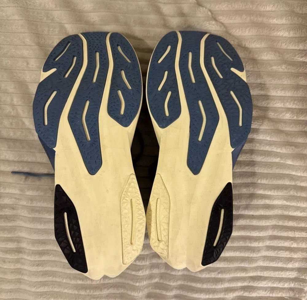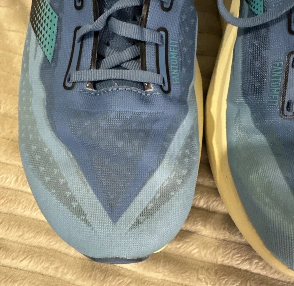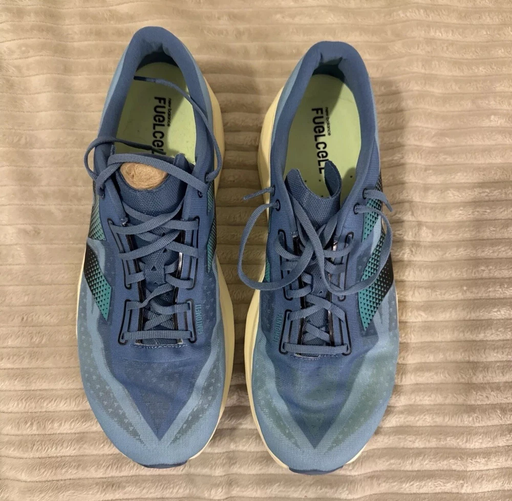 This is a pre-owned pair of New Balance FuelCell Rebel v4 athletic running shoes, designed for men in a US size 15 wide (2E). The sneakers feature a mesh upper material for breathability and comfort during uptempo daily training and running. The New Balance FuelCell technology provides responsive cushioning and energy return for a comfortable and supportive running experience. Perfect for those looking for a quality pair of athletic shoes in a larger size.