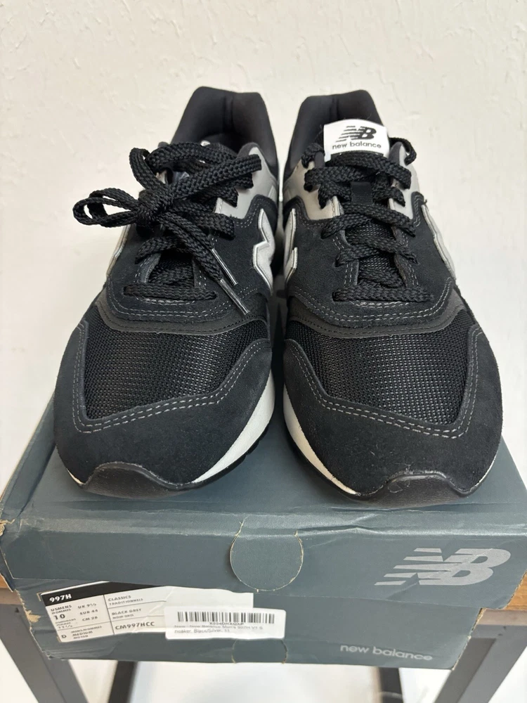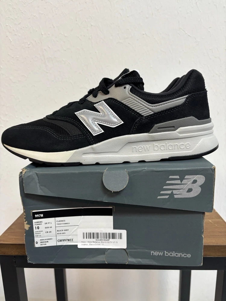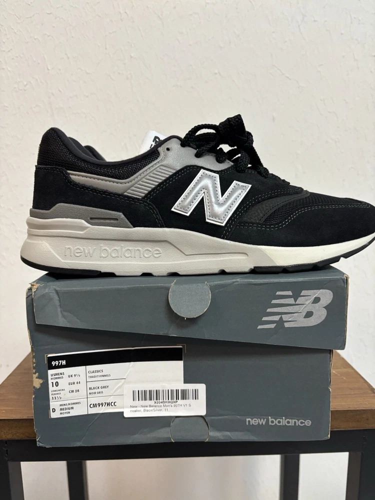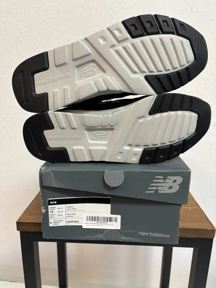New Balance Men's 997H Sneakers in Black/Grey, size 10, were manufactured in 2018. These lace-up sneakers feature a colorblock design with a low-top shoe shaft style. They are cushioned, comfortable, and breathable, suitable for various occasions like activewear, casual, and workwear. The shoes are part of the New Balance 900 Series, ideal for gym training, walking, running, and other fitness activities.