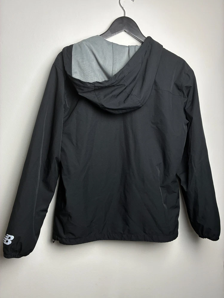 Men’s New Balance lightweight hooded jacket – Size S . Classic black shell with grey mesh lining , full zip front, and logo zip chest pocket. Adjustable hem drawcord, elastic cuffs, and branded zip pulls. Great for running, training, or casual wear. Lightly used with minimal signs of wear. See photos for condition and measurements.