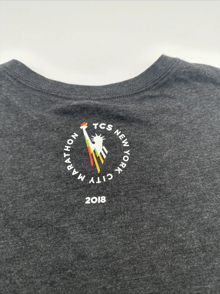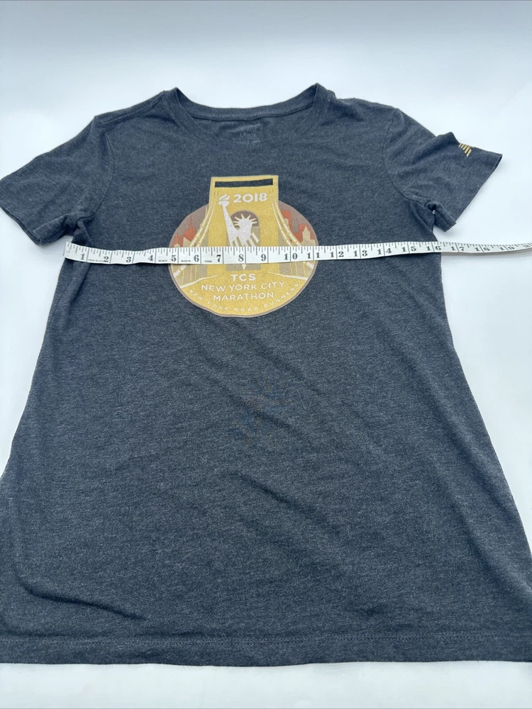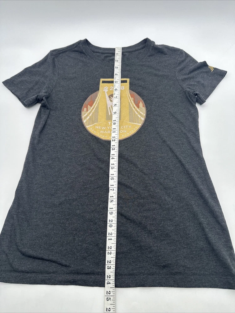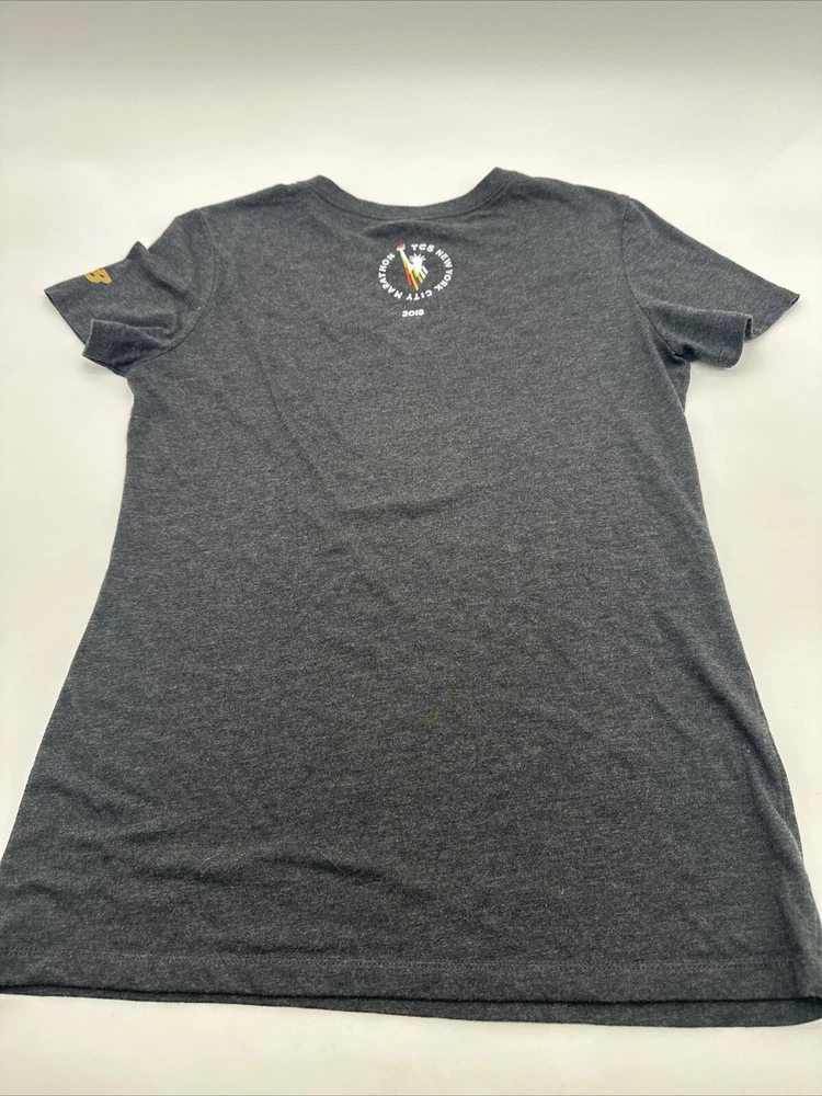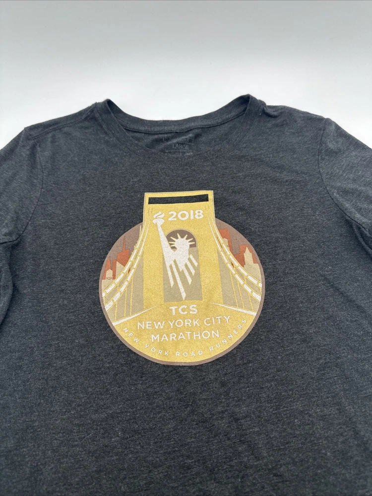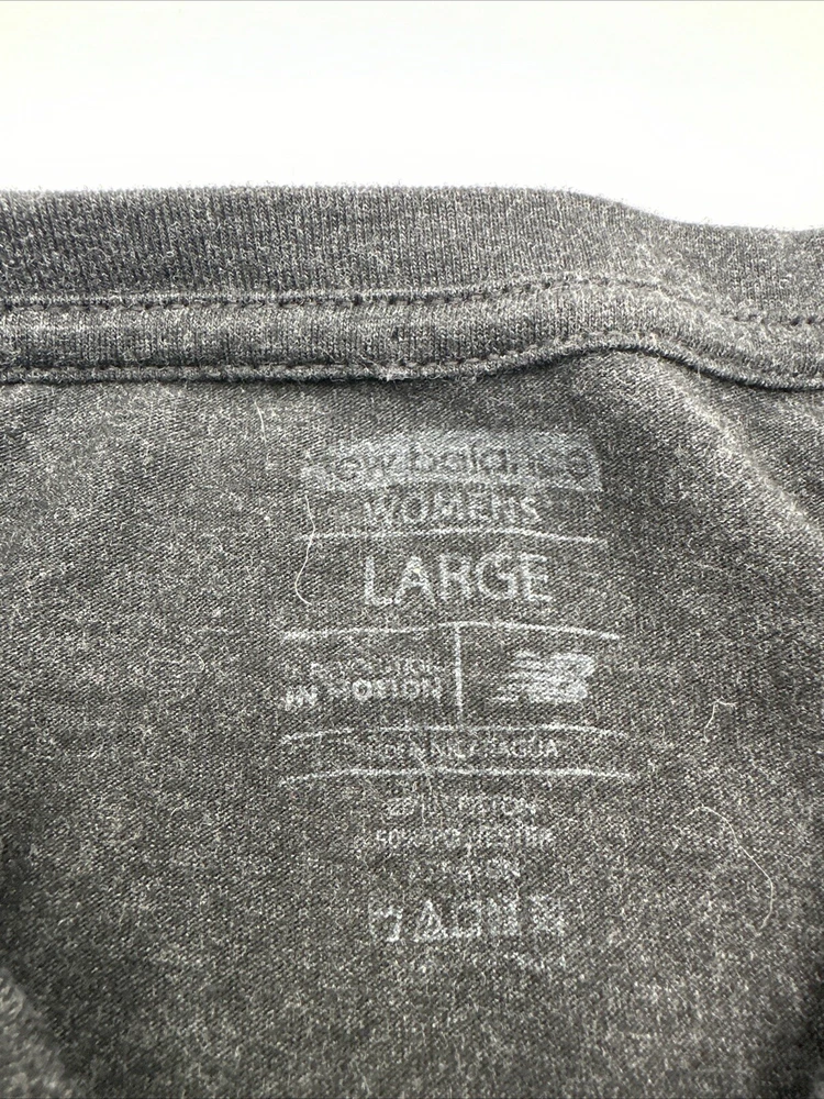 This is a New Balance NYC Marathon T-Shirt for women in size Large. It features a graphic print in gray, a crew neck, short sleeves, and a pullover closure. Made of 100% cotton, this classic fit T-shirt is perfect for activewear. Easy to care for, it is a comfortable and stylish choice for casual wear or working out. *Check the images above for the flaws and measurements of the item.