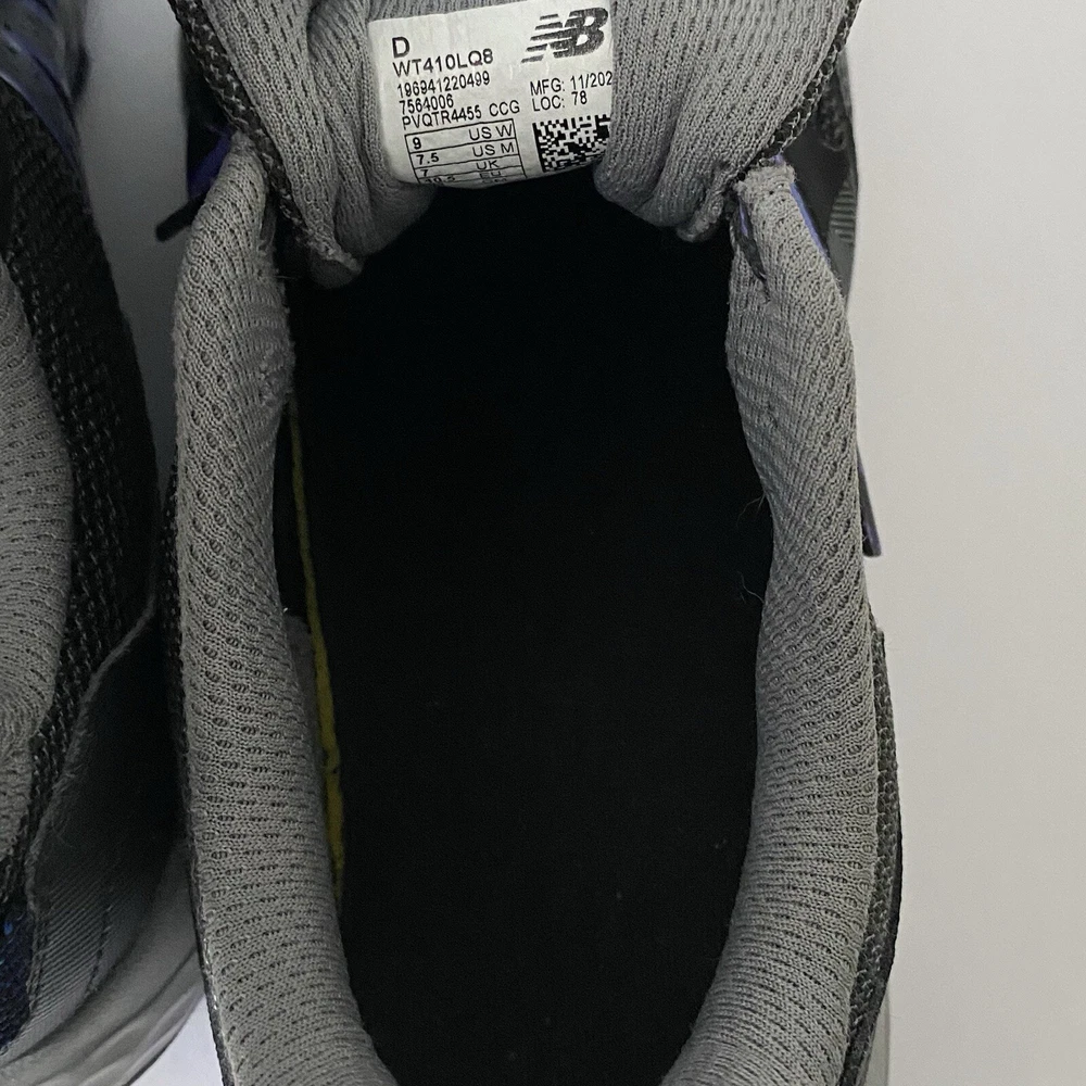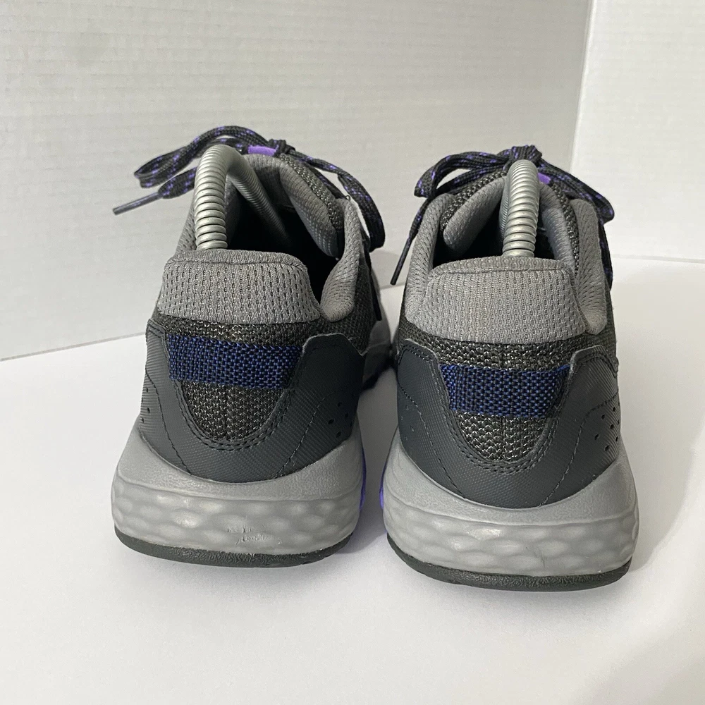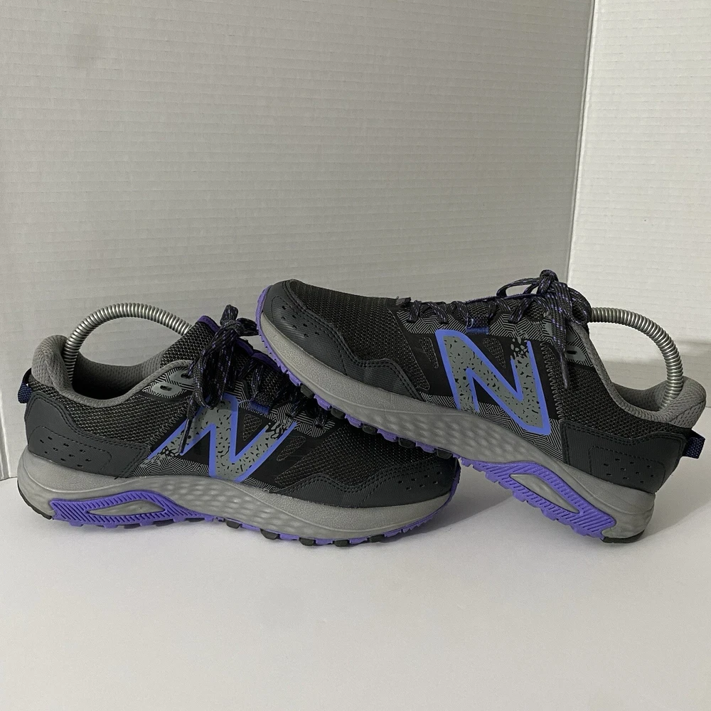 New Balance Women's 410 V8 Trail Running Shoe in Shadow Grey/Electric Indigo, size 9. This lace-up sneaker features a fabric, mesh, and synthetic upper with a rubber outsole. Ideal for activities like running, walking, and hiking, it offers comfort and support with a foam insole. The design includes colorful accents and a solid pattern, making it a stylish choice for outdoor sports in any season. In used condition has lots of life left