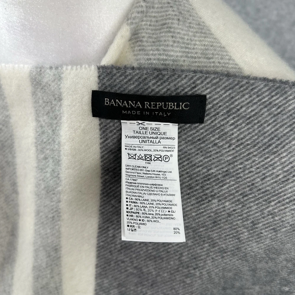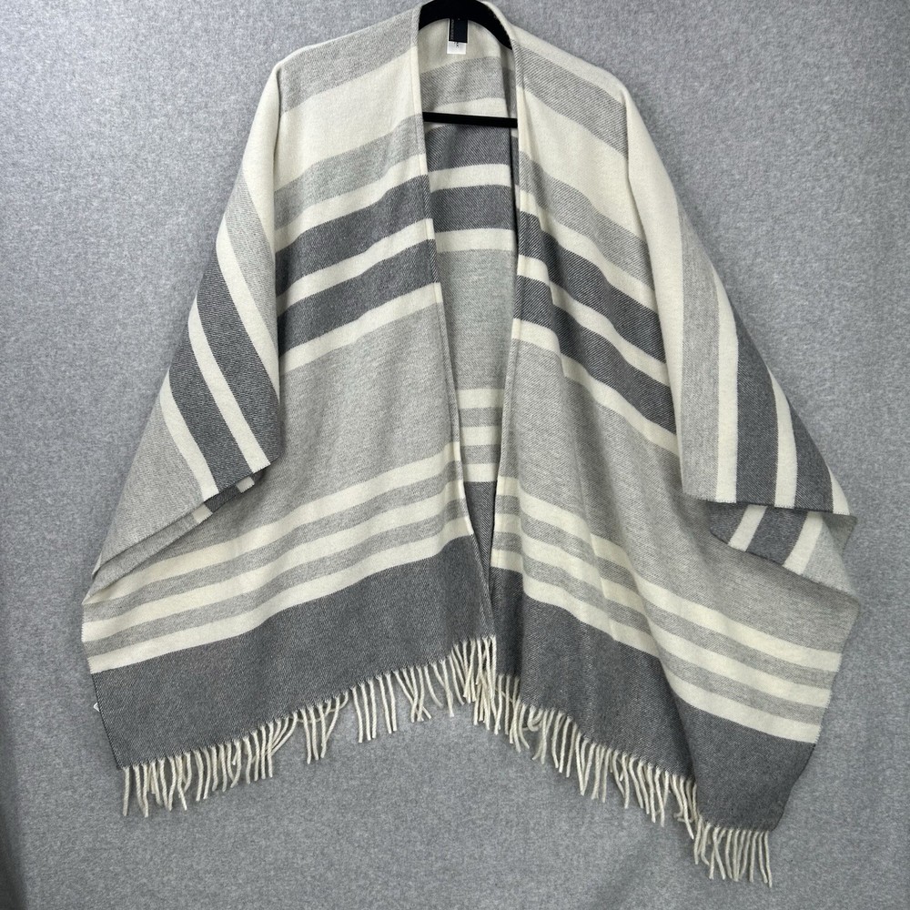 Size Type: Regular Garment Care: Dry Clean Only Size: One Size Color: Gray Department: Women Sleeve Type: Kimono Sleeve Vintage: No Pattern: Striped Season: Fall, Spring, Winter Style: Wrap Theme: Bohemian, City, Classic, Western, Cozy, Cabin, Mountains, Quiet Luxury, Neutral, Mature Accents: Fringe Features: Open Country/Region of Manufacture: Italy MPN: 2050550 Occasion: Business, Casual, Party/Cocktail, Travel, Wedding, Workwear Fit: Relaxed Brand: Banana Republic Type: Sweater Personalize: No Material: Polyamide, Wool, Wool Blend