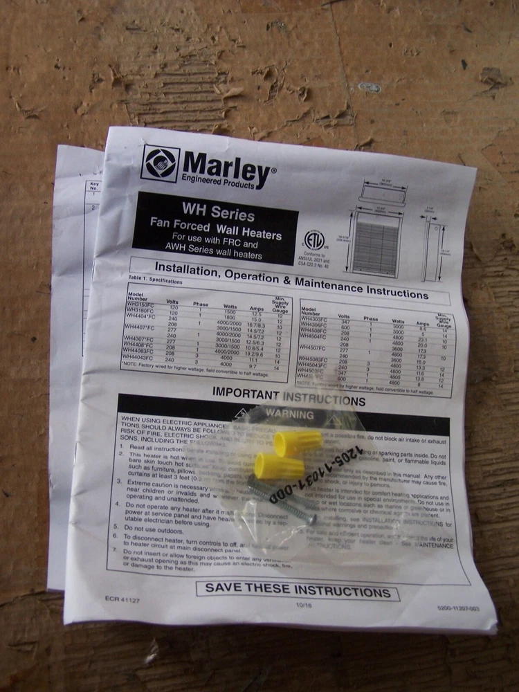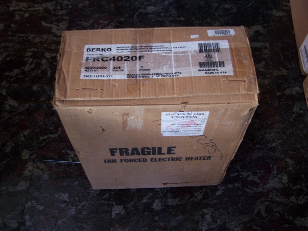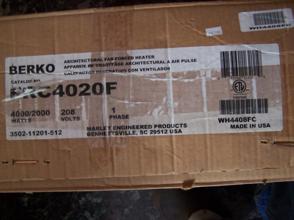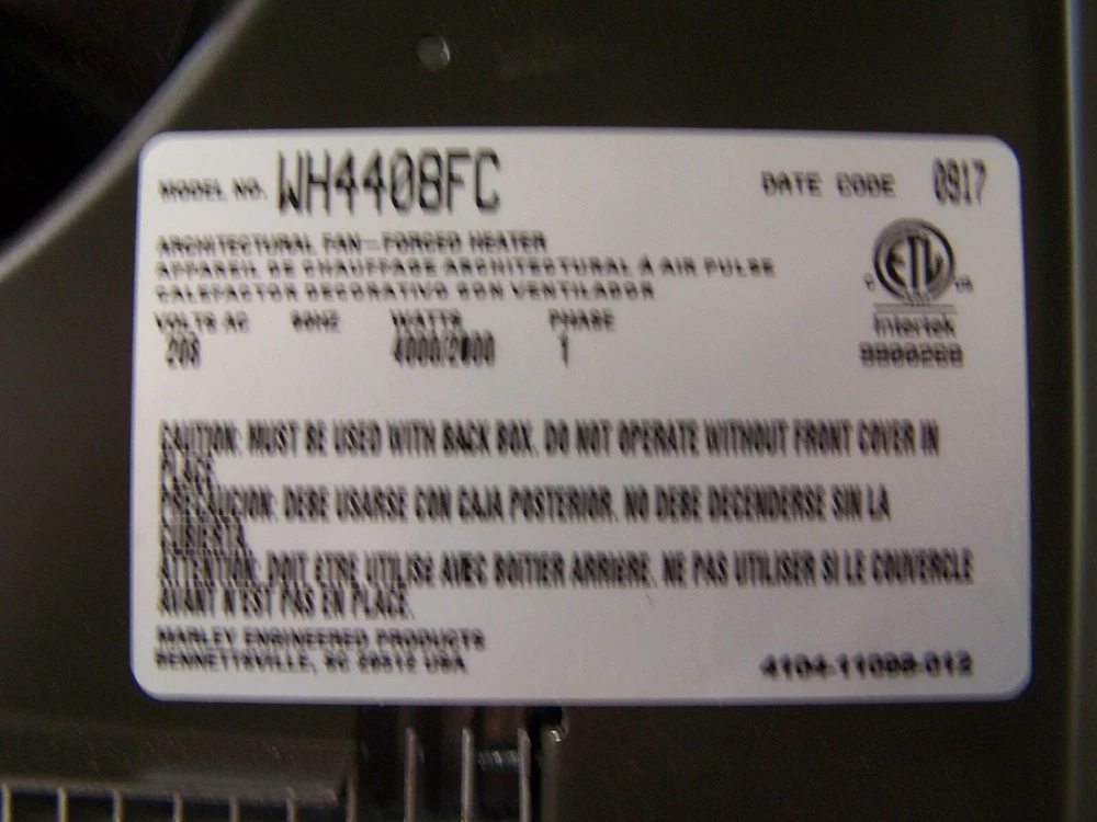 This is a New Berco/Marley Engineered Products electric forced air wall heater. Model # WH4408FC. Cat # FRC4020F. If you need this part you may need it fast. We will ship immediately after payment clears. Contact us if you have any questions.. If any shipping options are chosen other than our free shipping, those funds will not be refunded for any reason if the part is returned. Marley Model # WH4408FC POWER: 4000/2000Watts 208V BTU: 13,000 COLOR: Bronze IDEAL SPACES: Vestibules; Entrance Ways; Lobbies; Hallways; Stairwells; Restaurants; Conference Rooms; Offices; Basements; Family Rooms TEMP RANGE: 40-90F CFM: 100 GRILLE SIZE: 19-5/16" H x 15-3/4" W x 1-1/4" D BACK BOX SIZE: 18-1/4 H x 14-3/8 W x 3-7/8 D