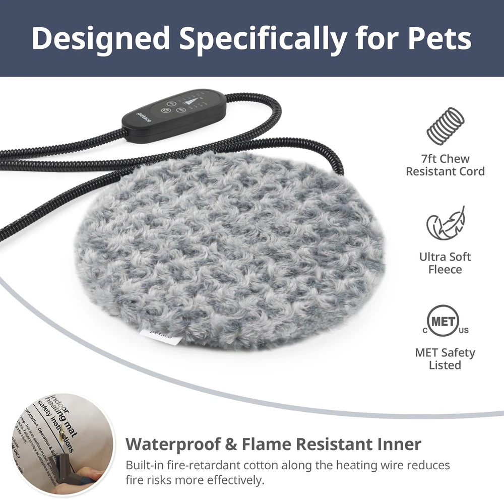 Adjustable Temperature Heated Cat Bed & Dog Heating Pad with Timer, Chew-Resistant Cord, Thick and Soft Cover, Indoor Pet Heating Pad, Diameter 11.8" Hassle-Free Control: Set temp from 6 heat levels (approx 86°F - 131°F) and auto-off function for safety via 4 timer options Pet Friendly Design: 7ft chew-resistant cord to prevent pets from chewing wires; waterproof PVC liner handles spills or messes easily Soft Rosebud Fabric Surface: Upgraded smooth and durable rosebud cover provides cozy warmth for pets and complements home decoration Fire-Retardant Construction: Built in a 7-layer protective structure, flame-resistant cotton and sealed tech for safety; MET Certified for peace of mind Multi-Size Available: Extra Small Size (diameter 11.8") perfect for small animals weighing around 6 lb, e.g., rabbits and kittens