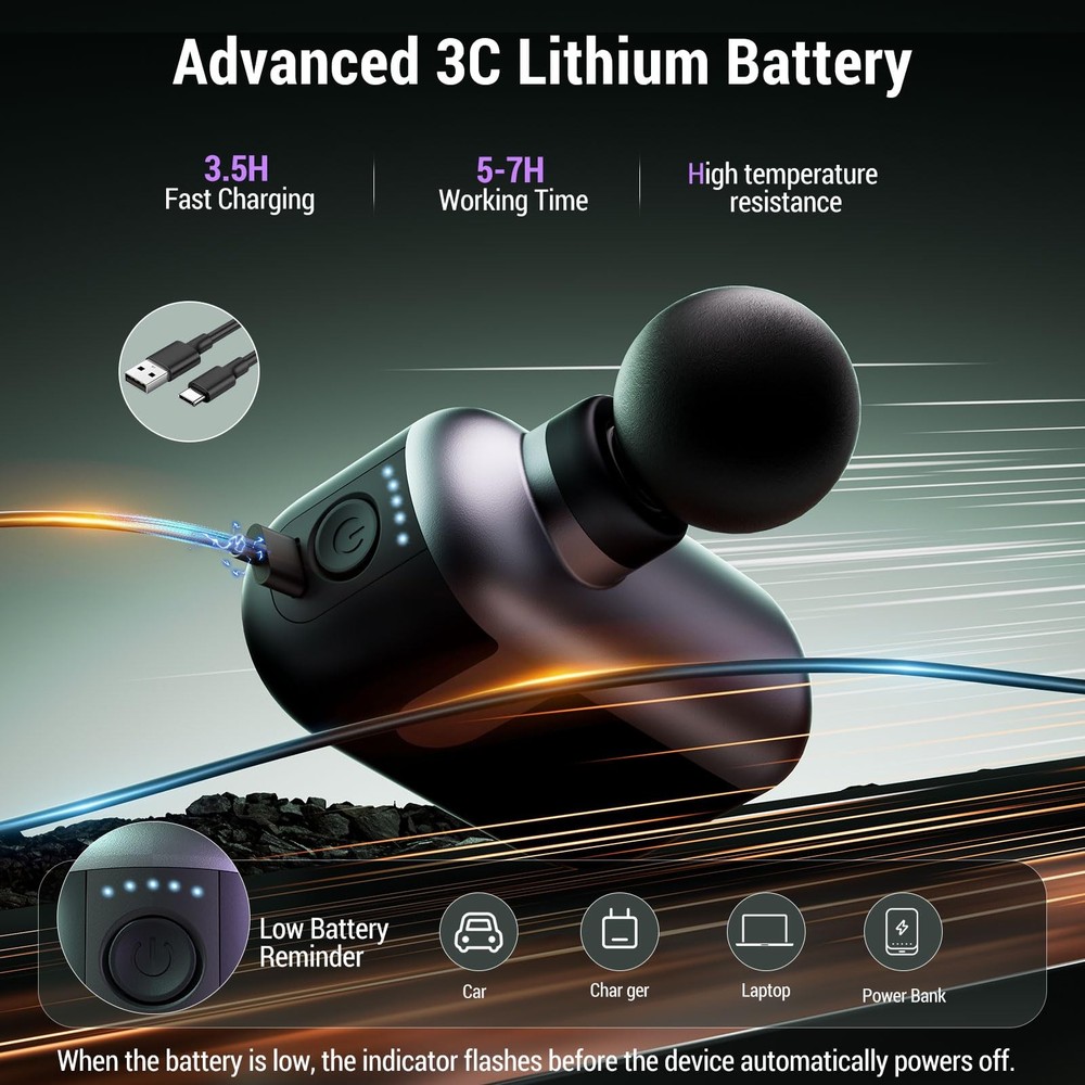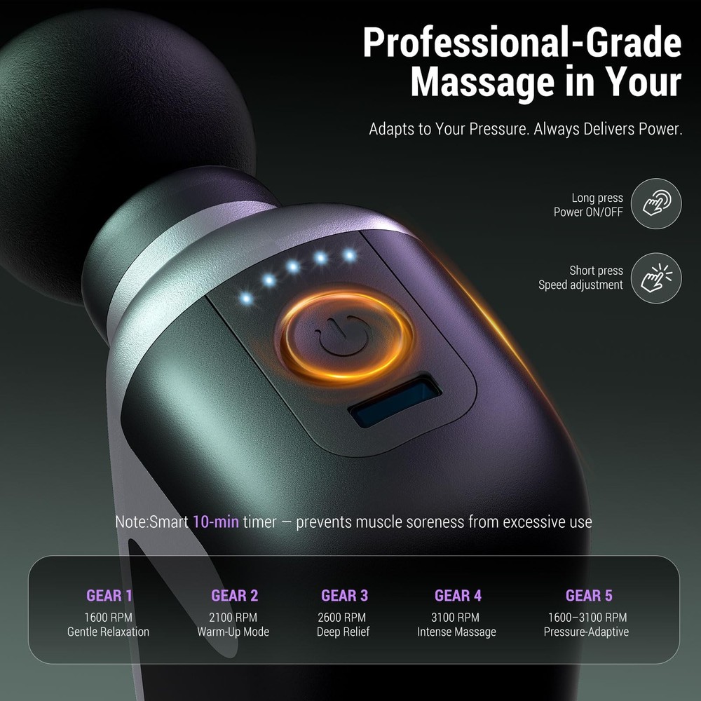Professional Muscle Relief Anytime Experience deep tissue relaxation with this compact, handheld massage gun. Equipped with a high-torque brushless motor and 5 adjustable speeds (1600–3100 RPM) with 8mm amplitude, it effectively loosens tight muscles,soothes tired muscles, and supports post-workout recovery. Running under 45dB, it ensures quiet, comfortable sessions while delivering consistent power. Customizable Massage Experience Featuring 9 interchangeable massage heads, this percussion gun allows you to target neck, shoulders, back, arms, legs, and feet. Switch easily between gentle and deep tissue massage for tailored intensity, ensuring a fully personalized massage experience. The ergonomic design ensures comfort even during extended use. Portable & Travel-Ready Weighing just 0.5 lb and measuring 4.13 x 3.54 x 1.57 inches, this mini massage gun is ultra-compact and perfect for on-the-go relief. Slip it into your gym bag, backpack, or suitcase to relieve tension anytime—after workouts, long hours at a desk, or while traveling. Long-Lasting Power Equipped with a 3C Power Battery, enjoy up to 5–7 hours of continuous use on a single charge. Fast Type-C charging fully recharges the device in just 3.5 hours. The built-in 10-minute auto-off prevents overuse and protects your muscles and skin while preserving battery life, ensuring safe and reliable performance every time. Ideal Gift & Support Sleek, portable, and powerful, this mini percussion massage gun makes a thoughtful gift for birthdays, holidays, or special occasions. Backed by a 5-year and responsive 24-hour customer support, it offers peace of mind, long-lasting comfort, and a premium wellness experience for friends, family, or yourself. Perfect for: gym enthusiasts, athletes, office workers, travelers, seniors, and anyone seeking fast, convenient, professional muscle relaxation at home or on the go. 【Advanced Brushless Motor】This compact massage gun features a high-torque brushless motor with 5 adjustable speeds (1600–3100 RPM) and an 8mm amplitude to help relax tight muscles and support post-workout recovery. Running under 45dB, it offers a quiet, comfortable experience with steady power. The ventless thermal management system prevents overheating without external vents, enabling longer sessions with consistent performance and greater motor durability. 【Personalized Massage System】This percussion massage gun features 9 interchangeable heads and adjustable speeds, allowing you to customize each session. Target neck, shoulders, back, arms, legs, and feet with precision. Switch easily between gentle relaxation and deep tissue massage, with tailored intensity to loosen tight muscles and support muscle recovery. Its ergonomic design ensures comfortable handling for longer sessions, delivering a fully personalized percussion massage experience. 【Ultimate On-The-Go Relief】Take your massage anywhere with this pocket-sized mini massage gun! Weighing just 0.5 lb and measuring 4.13x3.54x1.57 inches, it’s perfect for fitness enthusiasts, busy professionals, students, or travelers. Ideal for easing tight muscles after workouts, long hours at a desk, or during travel and study breaks. Its ultra-compact design fits in your gym bag, backpack, or suitcase, delivering fast, convenient relief anytime, anywhere. 【Long-Lasting Power】 Equipped with a 3C Power Battery, this cordless mini massage gun delivers strong, reliable performance for up to 5–7 hours of continuous use, so you can enjoy extended massage sessions without frequent recharging. Fast Type-C charging powers it up in just 3.5 hours. The built-in 10-minute auto-off protects your muscles and skin from overuse while preserving battery life, ensuring safe, efficient, and consistent performance every time. 【Gift With Assurance】Delight your loved ones with the perfect blend of style, power, and portability. This mini percussion massage gun offers professional muscle relaxation in a sleek, gift-ready package—perfect for birthdays, holidays, or special occasions. Compact and portable, it fits effortlessly into any lifestyle while delivering fast, effective relief. Backed by a 5-year and responsive 24-hour customer support, it’s a gift that brings lasting comfort, convenience, and confidence.