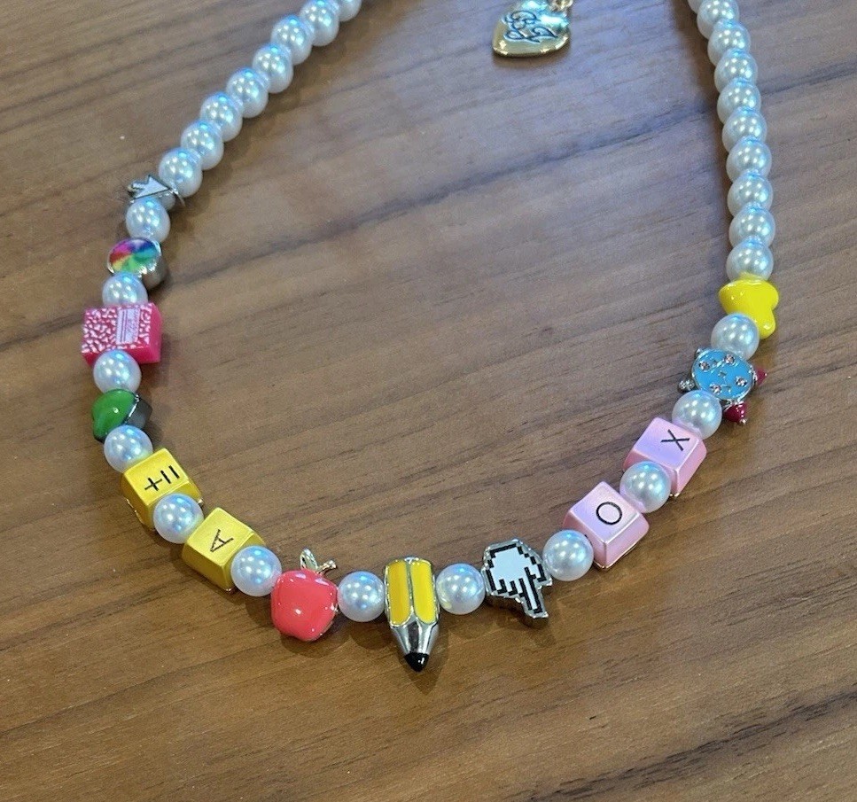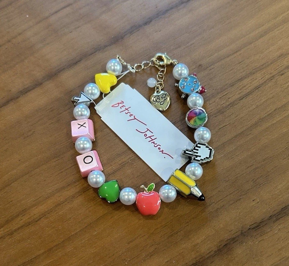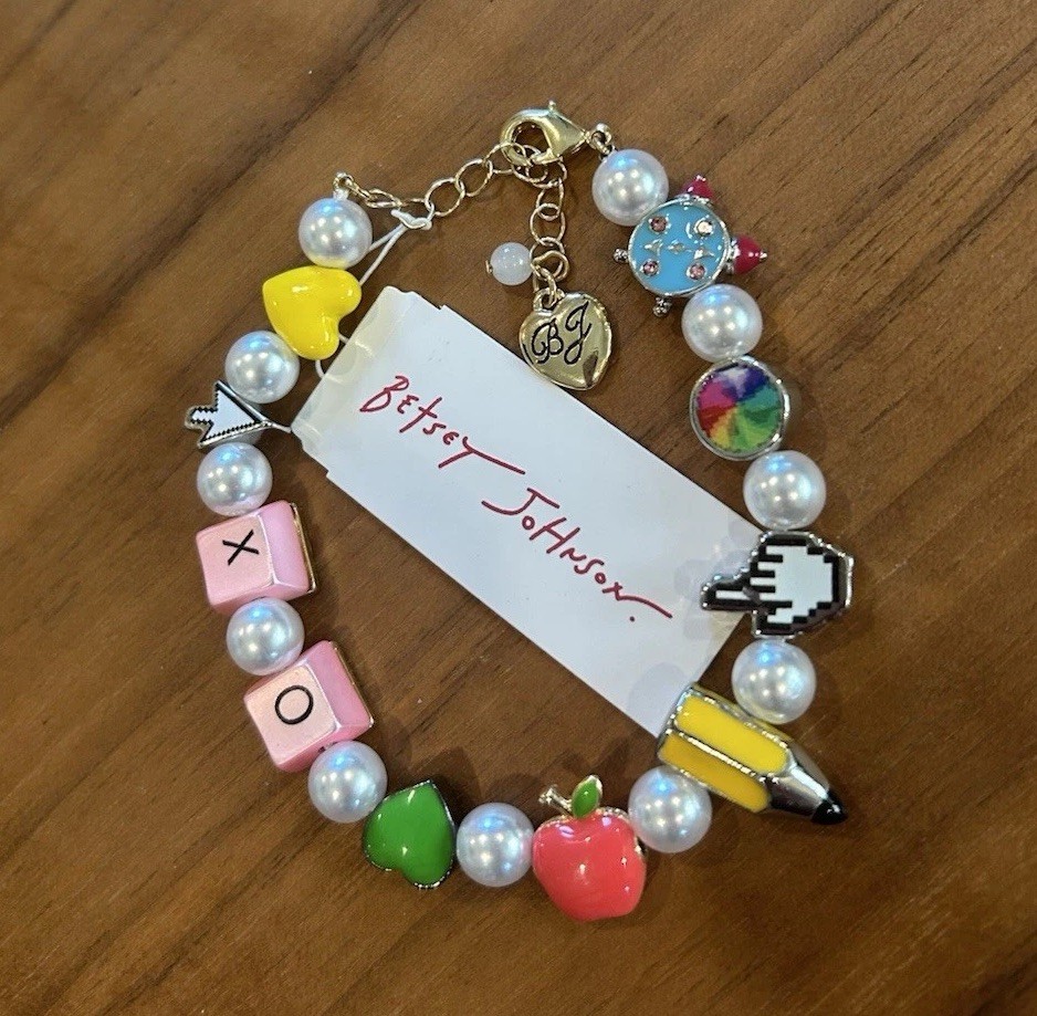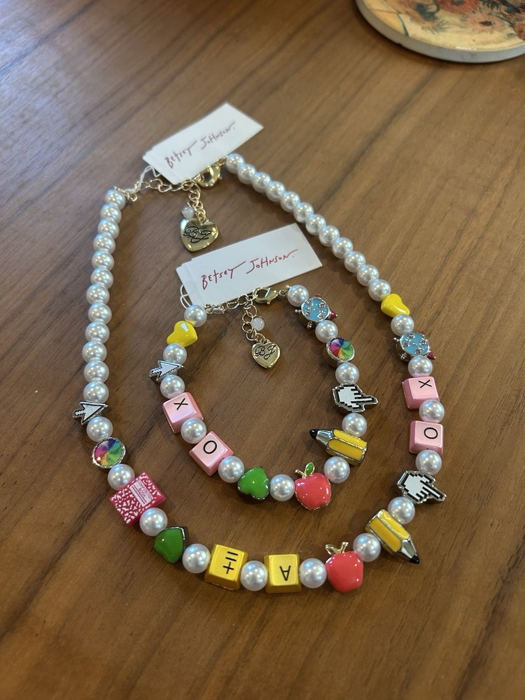 Introducing the Betsey Johnson Authentic School Motif Beaded Pearl Necklace & Earrings Set, a charming and playful accessory perfect for any occasion. The set features school-related charms in the shape of pendants, with a multi-tone gold metal construction and rhinestone accents. The adjustable lobster closure ensures a comfortable fit, and the set is signed by the Betsey Johnson brand for authenticity. Made with enamel, metal, and faux pearls, this set is a delightful addition to any jewelry collection. Thank you, GBC!