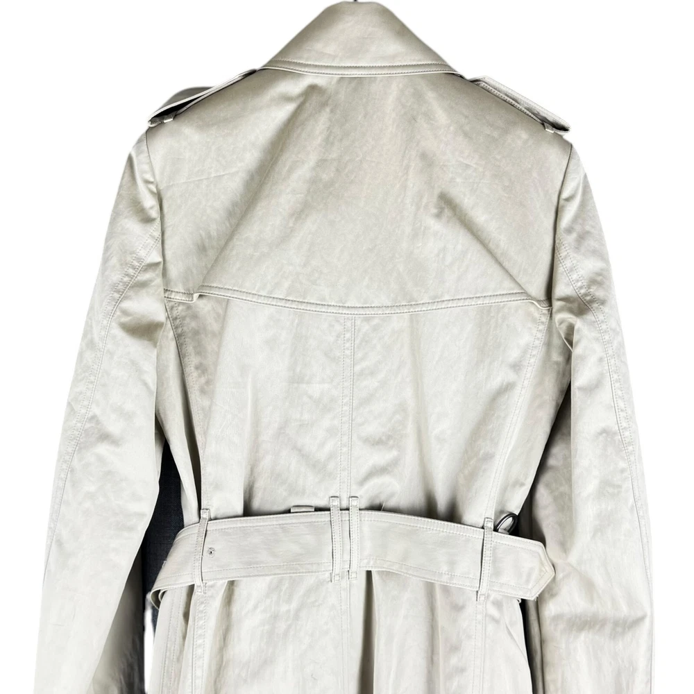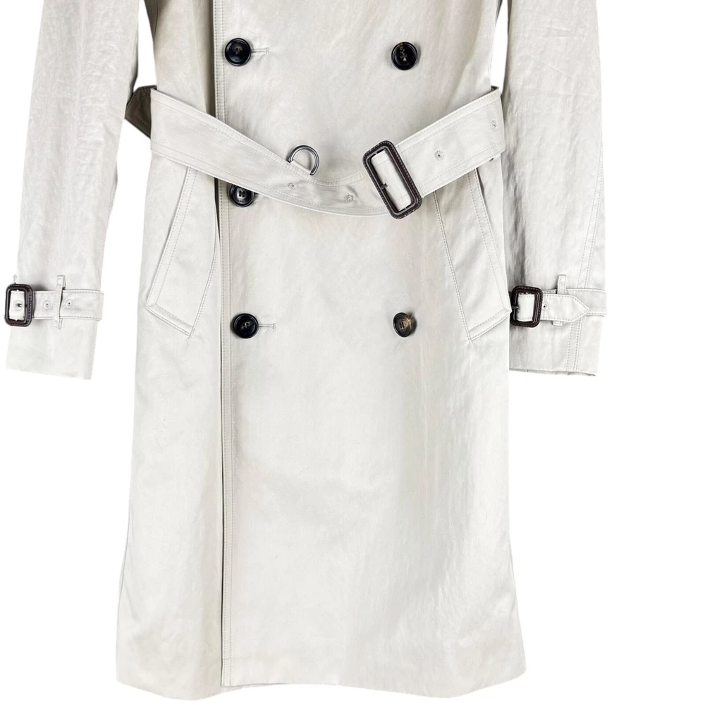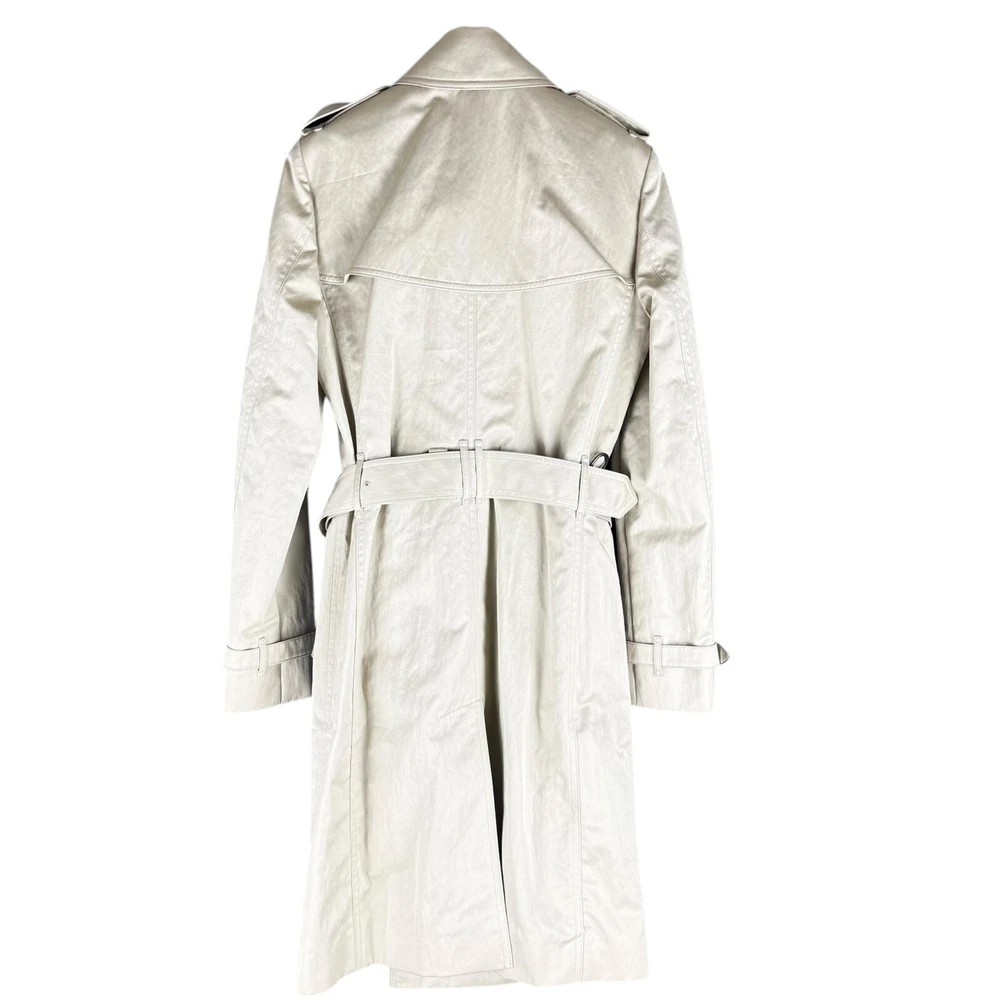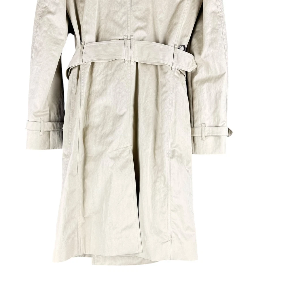 Exposed button fastenings at front collar Buttoned epaulette at shoulders Buckle-fastened tab at cuffs Double-breasted Storm flap Detachable buckle belt at waist Two pockets at front Branded buttons Single vent at back hem Fully nova check lined Brand New With Tags Retails: $2,650 Color: Stone Condition: New With Tags Material:67% Cotton 23% Polyamide Measurements: Pit to Pit: 17.25" Garment length: 37.5" Sleeve length: 23" Shoulder to shoulder: 15"