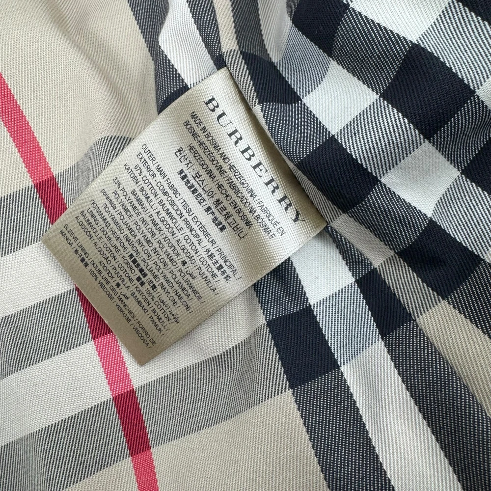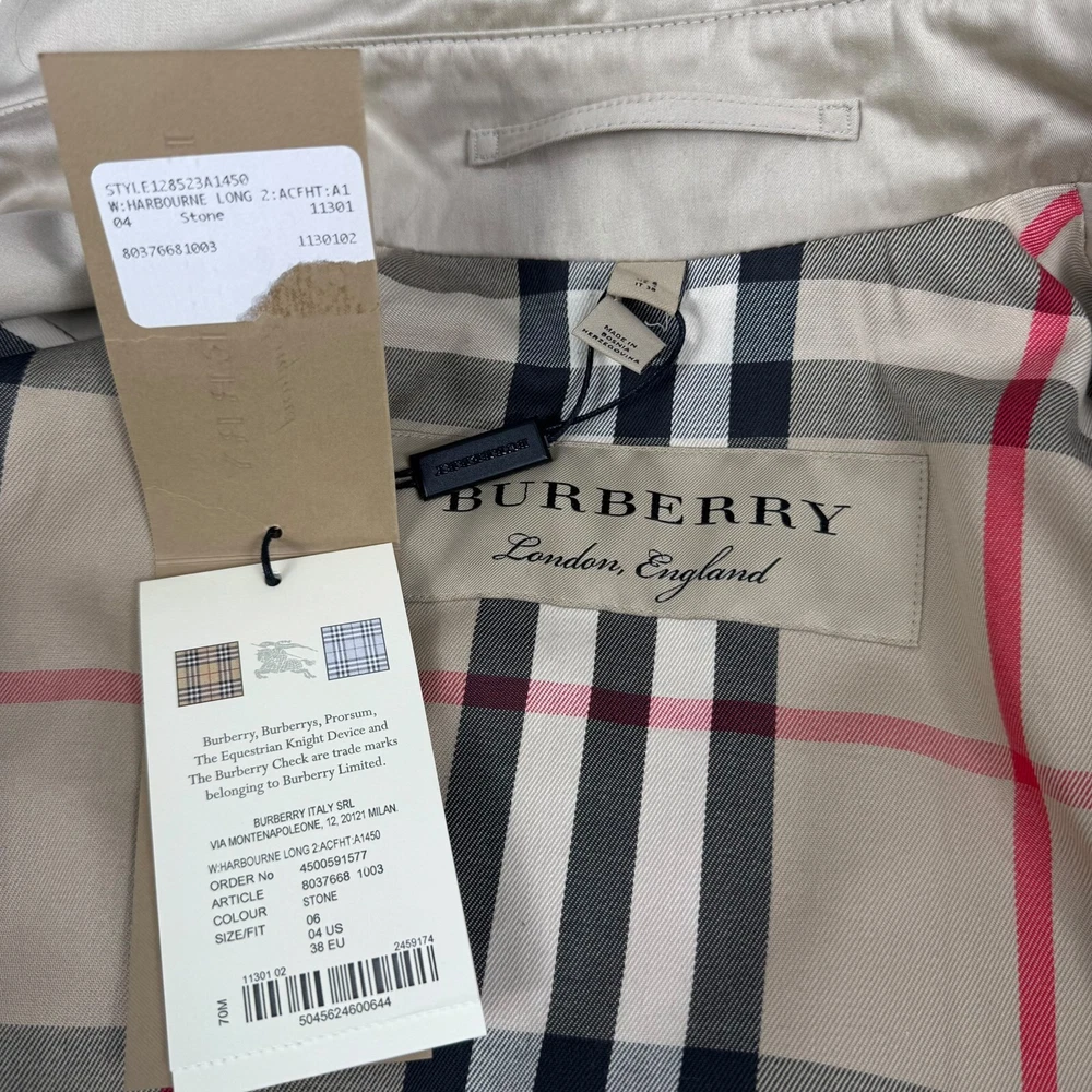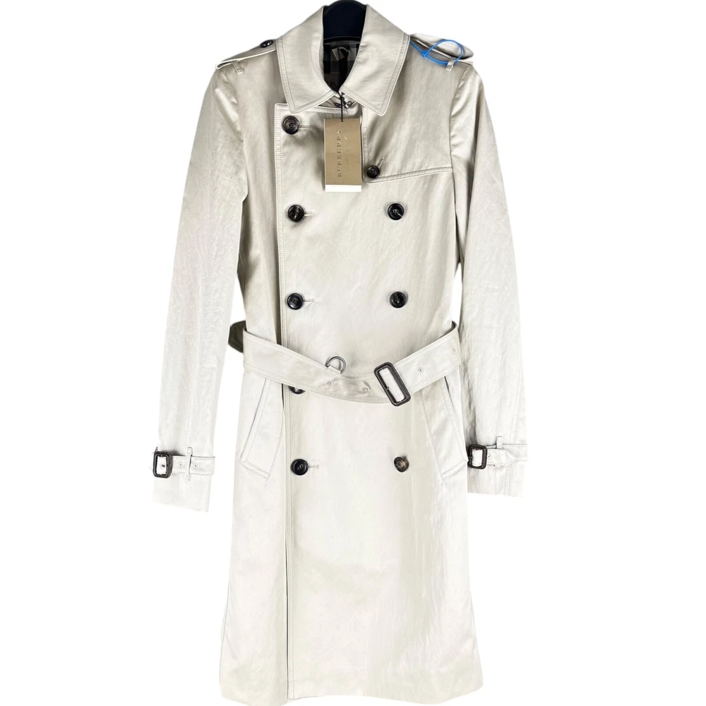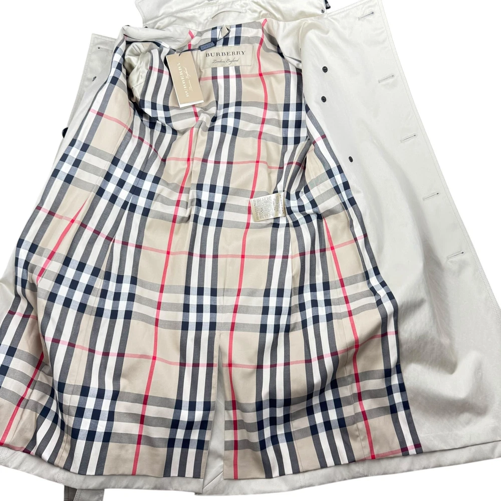 Exposed button fastenings at front collar Buttoned epaulette at shoulders Buckle-fastened tab at cuffs Double-breasted Storm flap Detachable buckle belt at waist Two pockets at front Branded buttons Single vent at back hem Fully nova check lined Brand New With Tags Retails: $2,650 Color: Stone Condition: New With Tags Material:67% Cotton 23% Polyamide Measurements: Pit to Pit: 17.25" Garment length: 37.5" Sleeve length: 23" Shoulder to shoulder: 15"