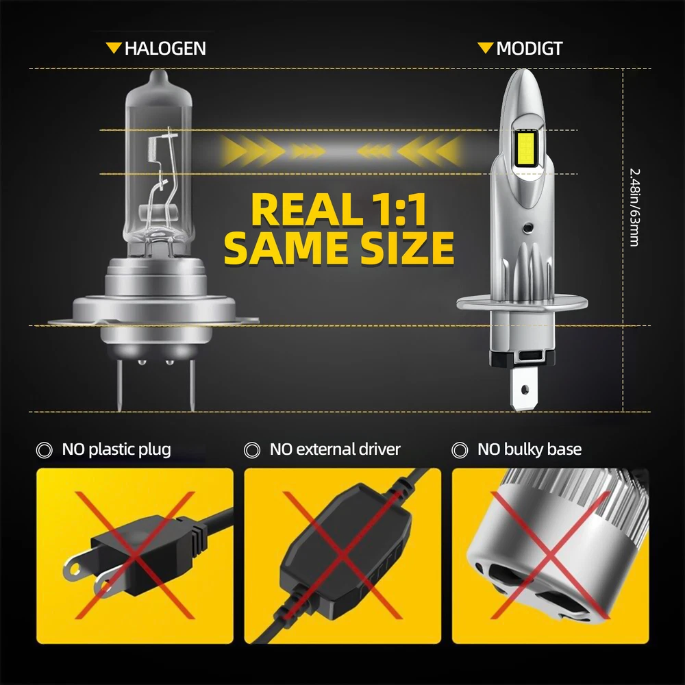 Package Included: 2 x H1 LED Headlights Bulbs Specifications Condition: 100% Brand New High Quality with Reasonable Price Bulb Size: H1 Voltage: DC 9V-32V Power: 100W/Per pair Lumen: 8000LM(4000LM/Bulb),no blind zone Color Temperature: 6000K LED type: CSP LEDs LED Chips: Customized LED chips Heat Dissipation Theory: Heat Pipe Technology + A380 Aluminum Heatsink Beam Angle: with 360 degree full angle illumination. Material: Aluminum material originally designed for aircraft Lifespan: 100,000 hours Operating Temperature: -40℃~+90℃ Warranty: 5 year warranty Package: 2xH1 LED Headlight Liu5092 Best choice of motor parts New CSP H1LED Headlight 8000lm Bulbs High Beam Conversion Kit 6000K white 2PCS Package Included: 2 x H1 LED Headlights Bulbs Specifications Condition: 100% Brand New High Quality with Reasonable Price Bulb Size: H1 Voltage : DC 9V-32V Power : 100W/Per pair Lumen : 8000LM(4000LM/Bulb), no blind zone Color Temperature : 6000K LED type: CSP LEDs LED Chips : Customized LED chips Heat Dissipation Theory: Heat Pipe Technology + A380 Aluminum Heatsink Beam Angle : with 360 degree full angle illumination. Material : Aluminum material originally designed for aircraft Lifespan : 100,000 hours Operating Temperature : -40℃~+90℃ Warranty : 5 year warranty Package: 2xH1 LED Headlight Suitable For: Pickup, Wagon, UTB, Cab, ATV, SUV, Jeep, Truck, Bus .etc Features: High-purity brightness The light-effect boundary is clear, without stray or dazzling light, making a great contribution to the safety of the driver.With High-purity brightness, strong penetrability and superior stability,Energy saving, environmental protection, through strict test, Use safer driving in the car,highly recommended. Shorter Size|Quick Installation Without Struggling Built with a smaller/ shorter size than the common LEDs in the market without building an external driver, directly plug into the factory housing. The same design with the OEM halogen bulbs for easy installation. Long service life LED headlight bulb efficiently speeds up heat dissipation to prevent bulbs from overheating to ensure superior performance, prolonging their lifespan up to 100,000 hours,freeing you from the trouble of frequent replacements. IP67 Waterproof IP67water-resistant and designed for use in heavy rains, rainproof housing, can work even in extreme situations. Optimized Beam Pattern This bulb has 1:1 halogen filament design, apply for the same length and position as the halogen bulb. It focuses light to match the standard beam pattern and does not blind oncoming traffic, no dark spots, or foggy light. 400% BRIGHTER THAN HALOGEN Utilizing upgrade Flip chips with 6000k cool white, the H1 LED headlight bulbs providing further and wider visibility for you to see the deer, wild animals, falling rocks or other obstacles in advance to ensure safer driving at night. Better Heat Dissipation, Last Longer Cooling system with With a copper base board, cold pressed aluminum heat sink and EMC anti- electromagnetic interference. Better solve the dimming or over heated of led bulbs.the all-in-one compact aluminum design brings better heat dissipation than common plastic design, and intelligent IC make sure the LED conversion kits last longer. the all-in-one compact aluminum design brings better heat dissipation than common plastic design, and intelligent IC make sure the LED conversion kits last longer. Install Caution: As a safety precaution, make sure that the car has had time to cool down properly before starting the installation process. Put the vehicle into park or make sure it is securely in gear. Make sure to have the ignition turned off and the keys removed. Be careful to avoid burns, especially when turning on or off the vehicles lighting. Be careful to avoid crushing or cutting the bulbs. Also make sure to not touch the bulbs with your fingers, as this will cause blotting. Fully examine the connection of the contact points, ports and the wires as faulty connections can cause lighting problems. Make certain that the end of the bulb does not come in contact with the interior light shield of the headlight when adjusting the bulb. Please Note: Please check your car manual or original bulb to confirm the bulb size, length is correct or not before purchasing to save your time. Note: Please check whether it is fit your vehicle before purchase. The compatibility table is only for reference, please make sure to verify the bulb type of your vehicle before purchasing. We are happy to help if you need any further information. Please make sure the headlight housing has enough space for installation before purchasing. Professional installation is highly recommended. If you have any questions, please feel free to contact us. Item Specifics Brand Modigt Lighting Technology LED Suitable For Headlight High Beam Bulb Fitment Code H1 Number of Bulbs 2 Light Color Clear Type Light Bulb Waterproof Rating IP67 Lighting Type Specialty Headlight and Fog Light Color Temperature 6000K Wattage 100W Voltage DC 9V - 32V Lumens 8000LM/Set(4000LM/Bulb) Material Aluminum material originally designed for aircraft Bulb Life Hours Up to 100,000 Hours Placement on Vehicle Front, Left, Right Fitment Type Direct Replacement Manufacturer Warranty 5Years Beam Angle 360 Degrees Interchange Part Number H1 Operating Temperature -40°C ~ Features2 High brightness, long life, low fuel consumption Features3 Good focus intensity , long distance illuminating Model LED Bulbs / LED Lights Sealed Housing Dustproof & Waterproof Aluminum Heatsink Bundle Description LED headlight replacement Brightness 400% Brightness than halogen Chips Package includes 2xH1 LED Headlight Manufacturer Part Number Daytime running driving DRL plasma lighting Othere Part Number Upgrade for Sylvania incandescent bulb Function Replacement Halogen Light Bulbs Payment 1. It will be much appreciated that you finish your payment asap or it will make UPI (unpaid item case) on your account leading to be suspended or 