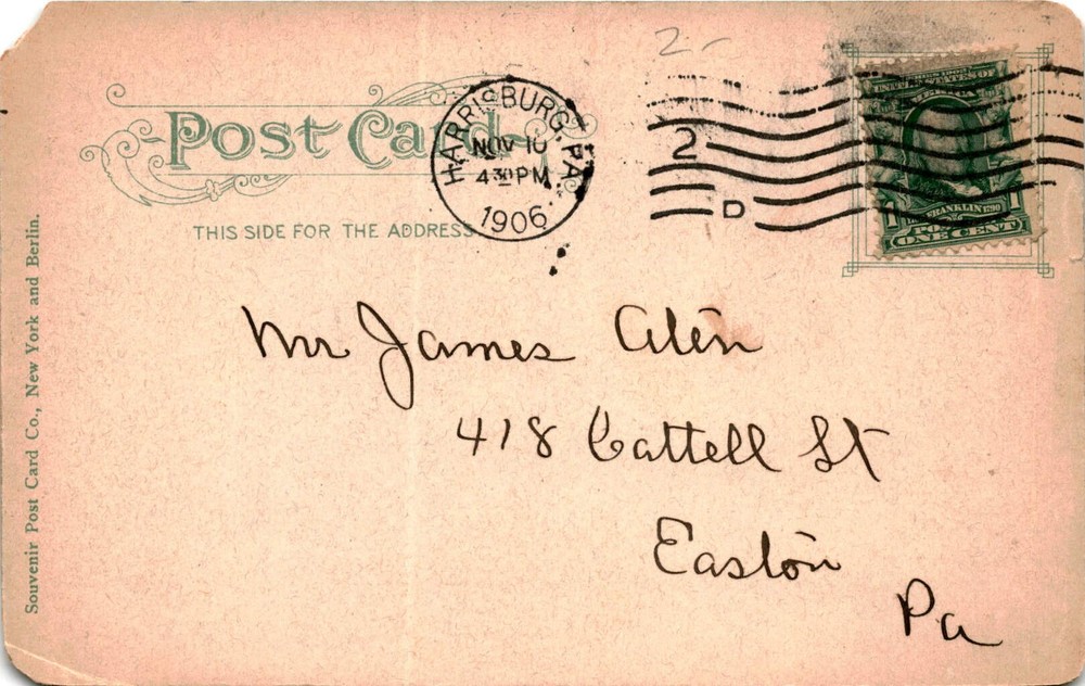 MAKE AN OFFER. THE MORE YOU BUY THE BETTER DEAL I WILL ACCEPT The postcard features an image of the New Capitol Building in Harrisburg, Pennsylvania, dated 1832. The postcard was printed by the German Souvenir Post Card Co. in New York and Berlin. The address on the back is for Mr. James Alen at 418 Battell St in Easton, Pennsylvania, with a postmark from 1906.